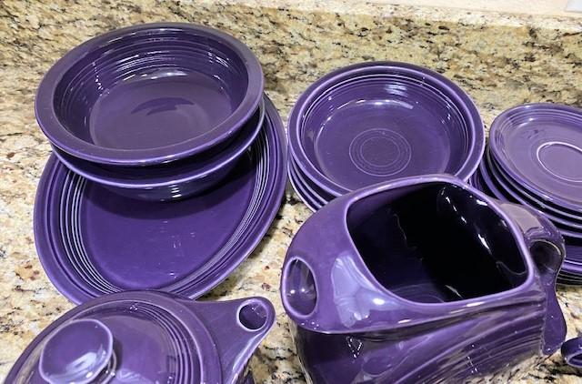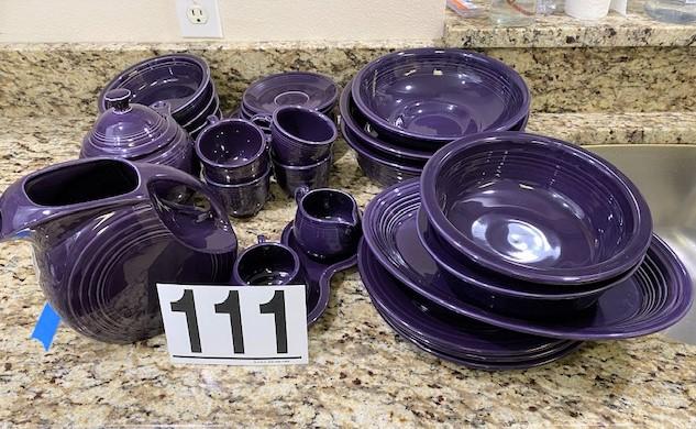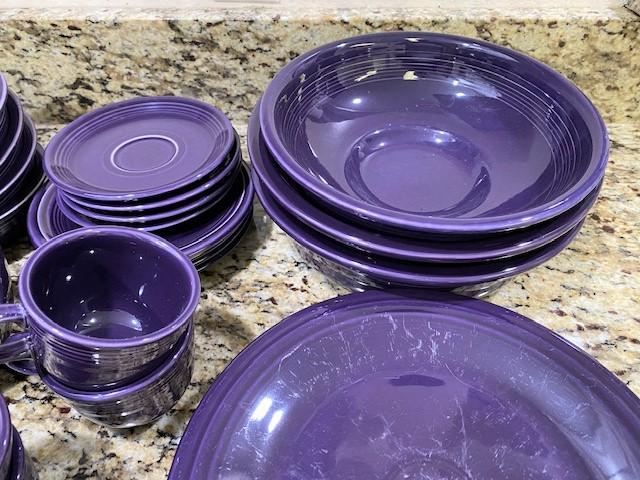 Includes: plates, bowls, coffee creamer, cups, saucers & serving bowls. One plate missing. Estimated total lot weight: 50lbs. Measurement: 13 1/2"W (serving platter) 10 1/2"diameter;each)