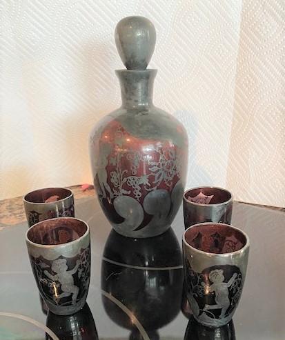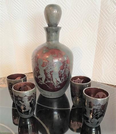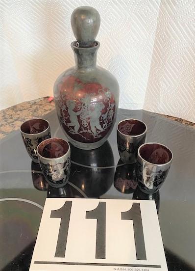 LOT#111K: Amethyst Glass Cordial Set Sterling Silver Overlay
