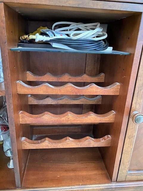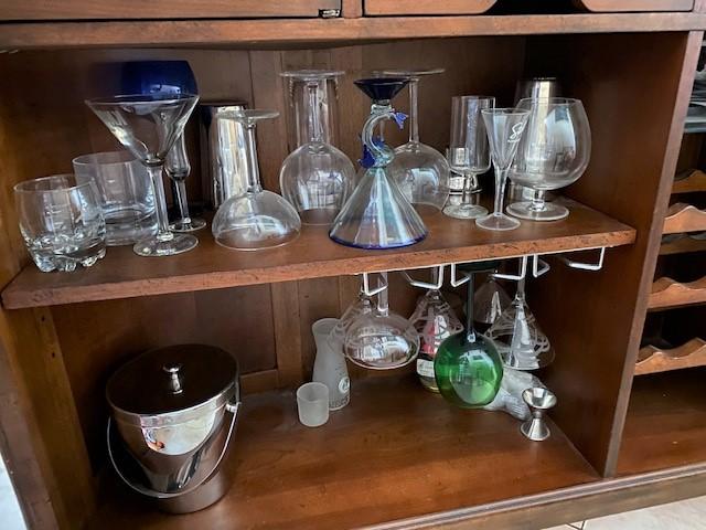 Two barstools. Bar has built in cutting board. Includes barware. Measurement: Bar: 68"L x 43"H x 20"D Stools: 33"H each