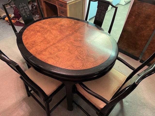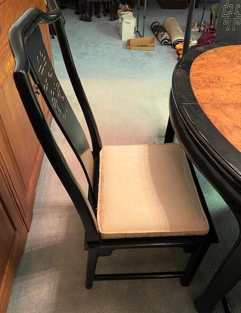 Asian Lacquered Dining Table w/ 6 Chairs (2 not pictured) & 2 Leaves. Manufactured in North Carolina. Estimated weight of lot: 200lbs. Measurement: 48"L x 38"W x 30"H (table no leaves) | 39"H x 23"W x 20"D (chair; each)