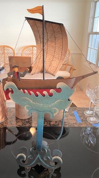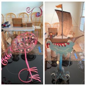 One is wire pink flamingo. Rocking sail boat that is counter weighted. Measurement: 23"H x 14"W(boat)