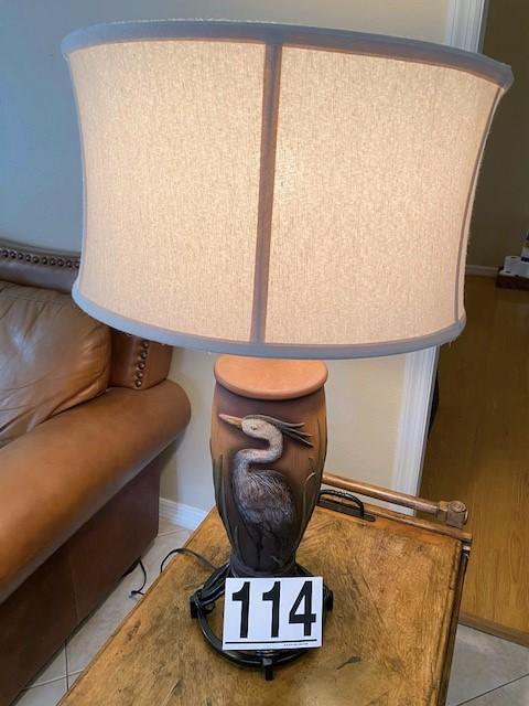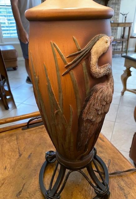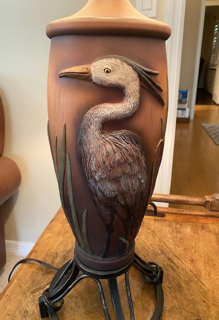 Ceramic lamp with blue heron. Working at time of cataloging. No apparent signs of damage. Measurement: 32"H