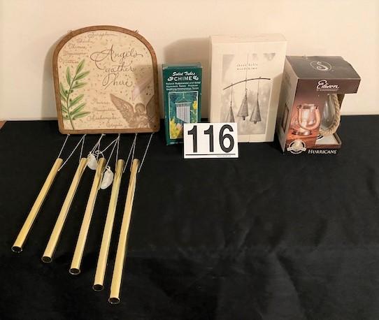Includes hurricane lamp. Mostly new. Estimated total lot weight: 10lbs. Measurement: 15 1/2"L x 11"W (largest chime)