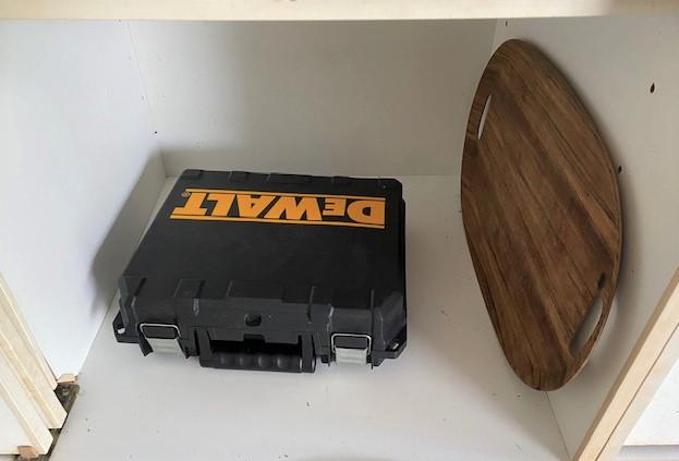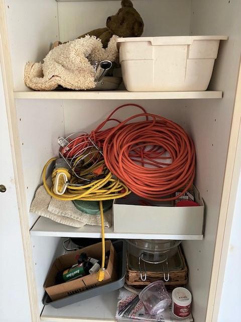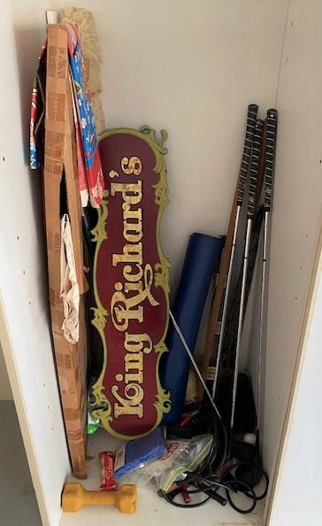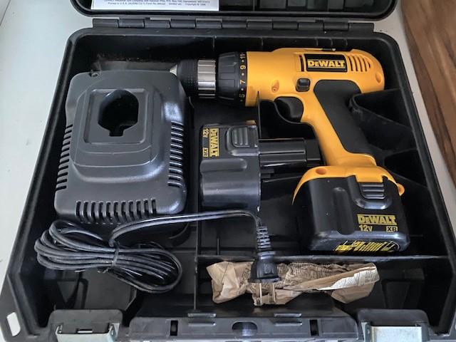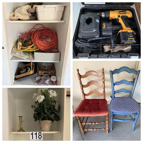Includes Dewalt drill, extension cords, serving ware, golf clubs, champagne flutes, assorted tools, and more. Also includes two chairs.