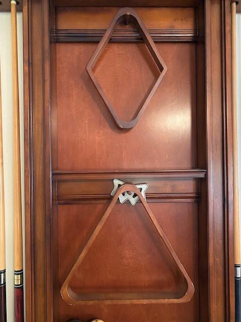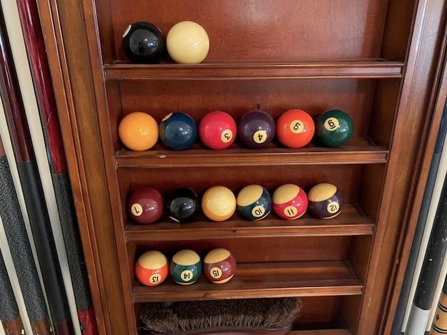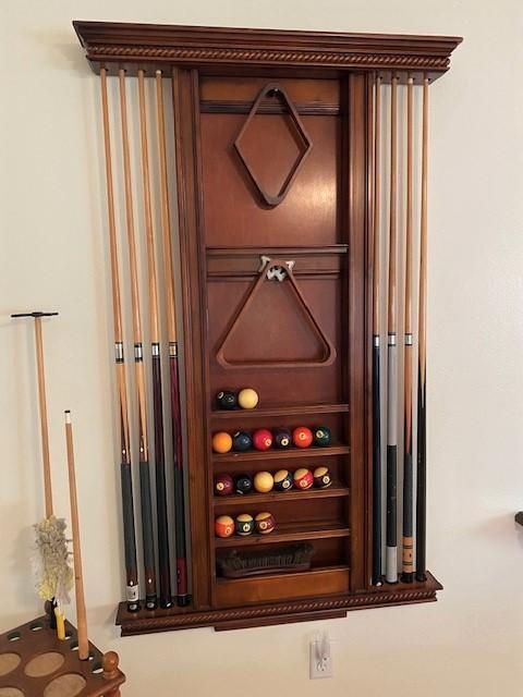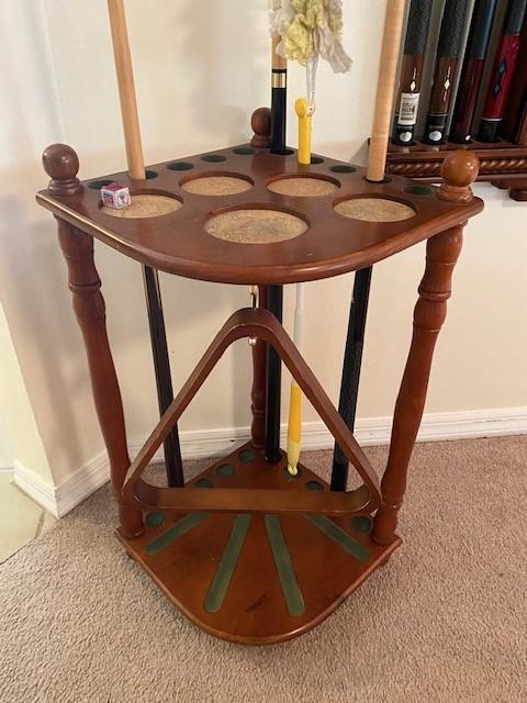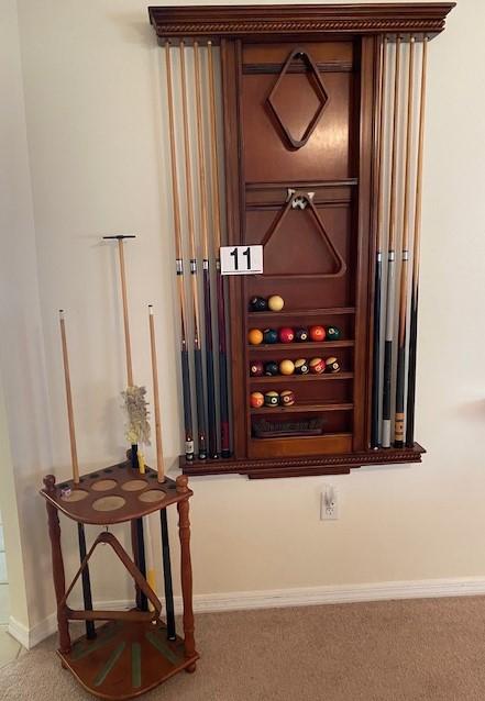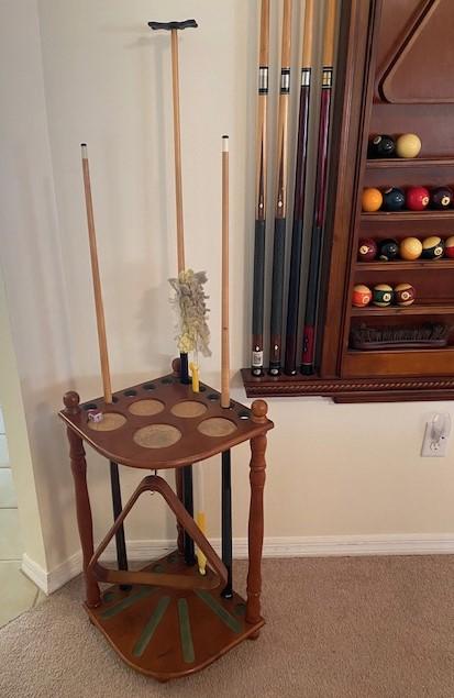 Includes 10 cue sticks, one bridge, three ball racks, balls, and more. Wall rack is mahogany colored. Measurement: 63"H x 36"W x 3 1/2"D (largest)