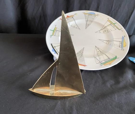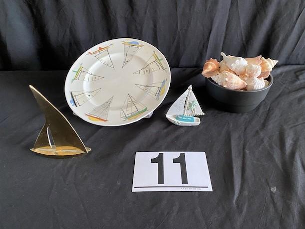 Includes seashells, brass sailboat, and more. Measurement: 10 1/2"W (plate) 7"H (brass sailboat)