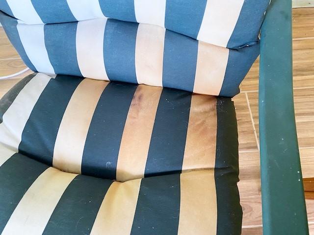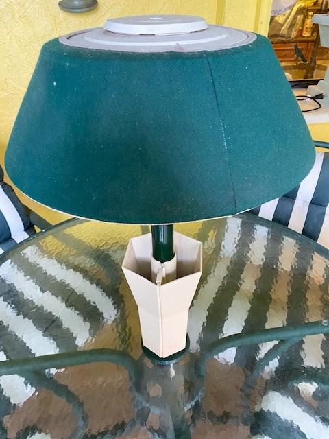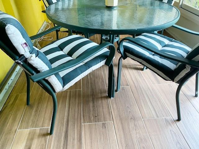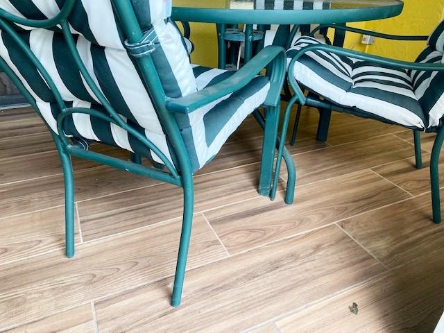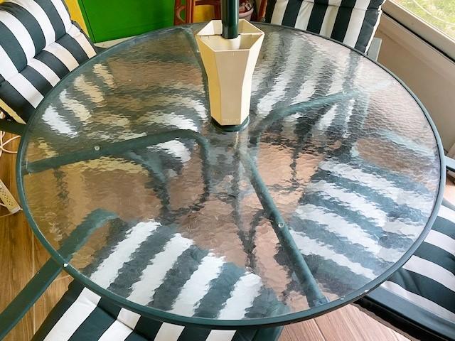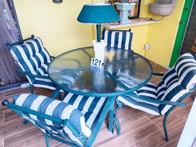 Includes glass top table, four chairs with cushions, and Brella vase with lamp. Appears to be rust free, but there are some scratches. One cushion has some staining (pictured). Measurement: 48 1/2"Diameter x 27"H (table) 36"H x 19 1/2"W (chairs, each) 26 1/2"H (lamp)