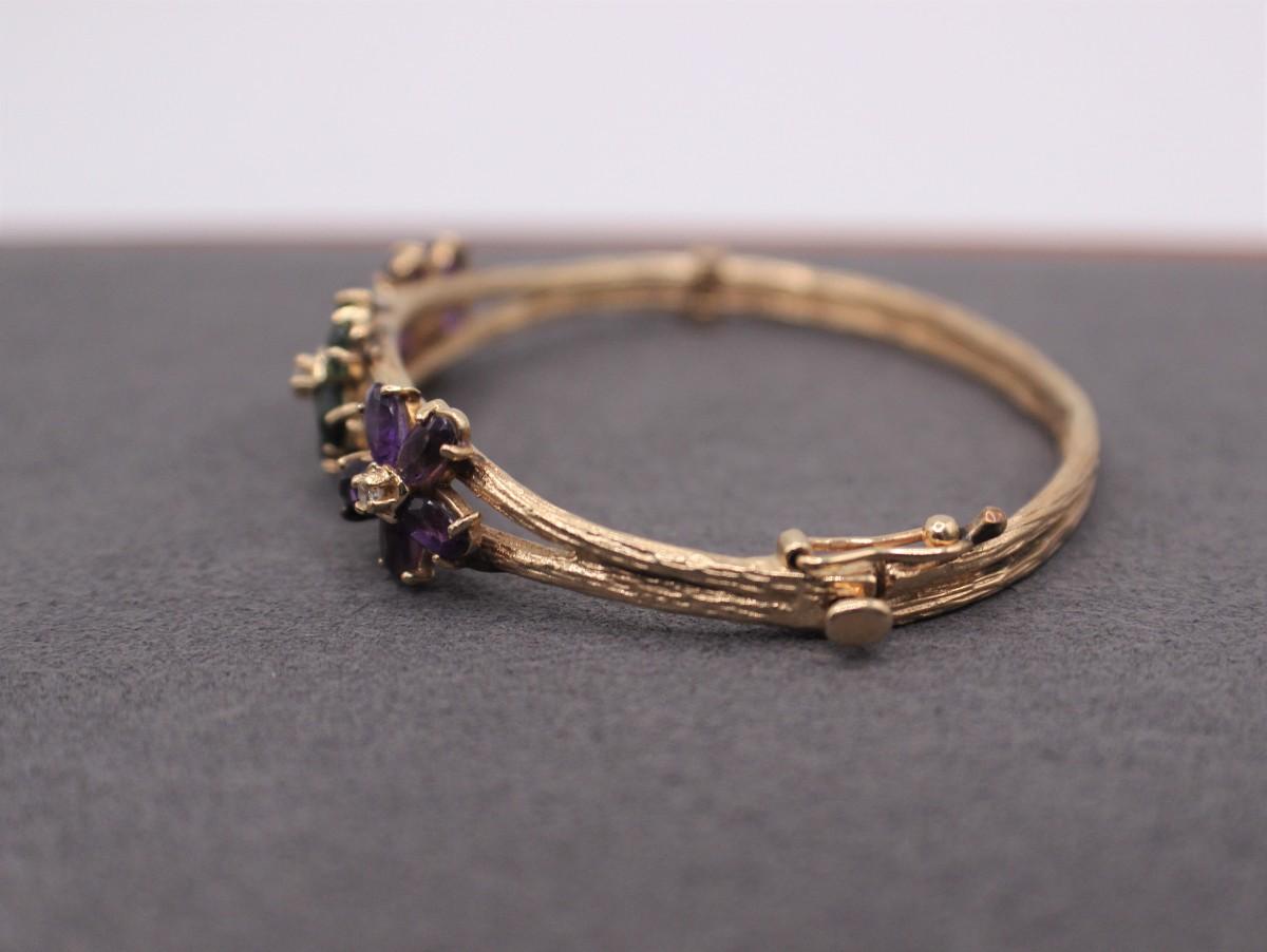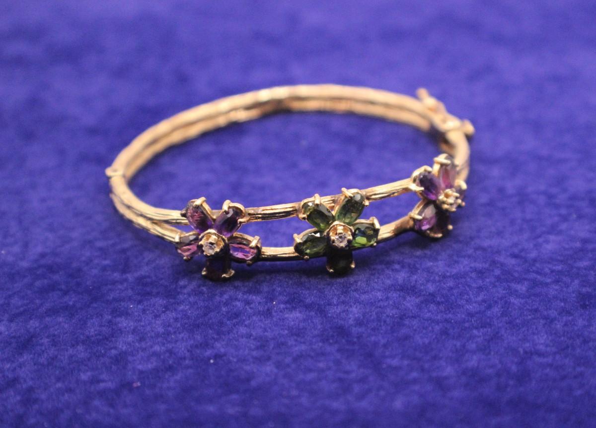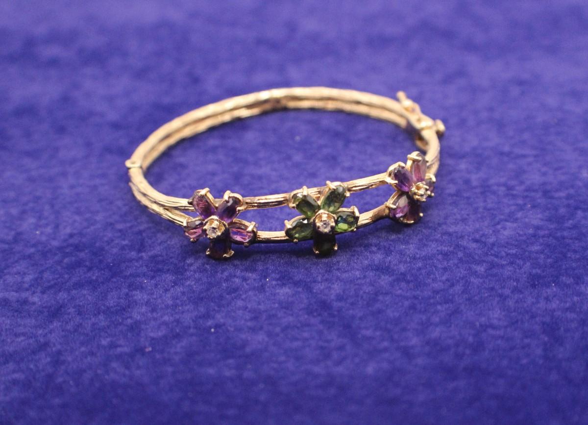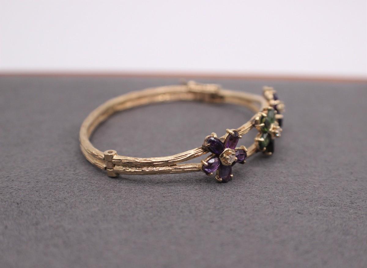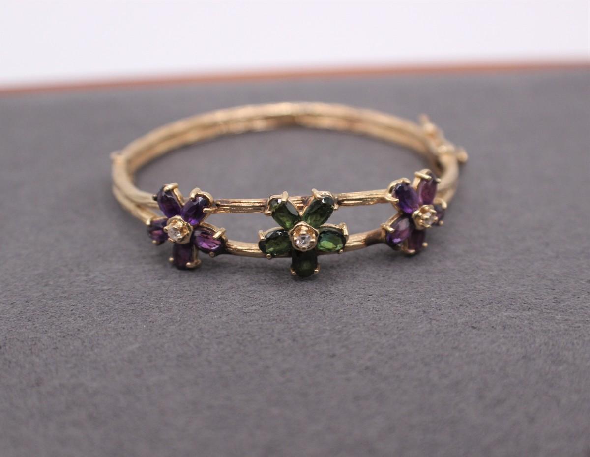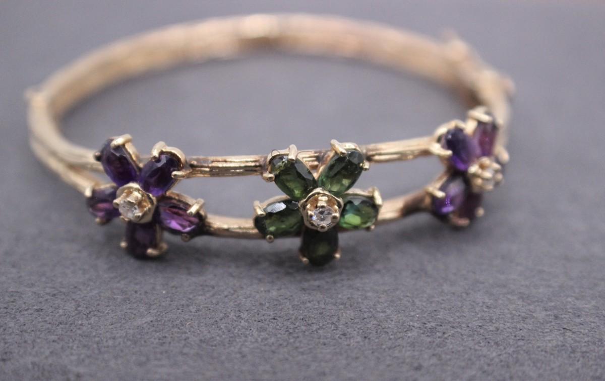 Green and purple tourmaline stones. Presidium Duo Tester used to test tourmaline. Germoro Ultra Tester used to confirm "Diamonds" Measures approximately 6" to 6.25". Niton XRF analyzer used to test metal (14k) purity