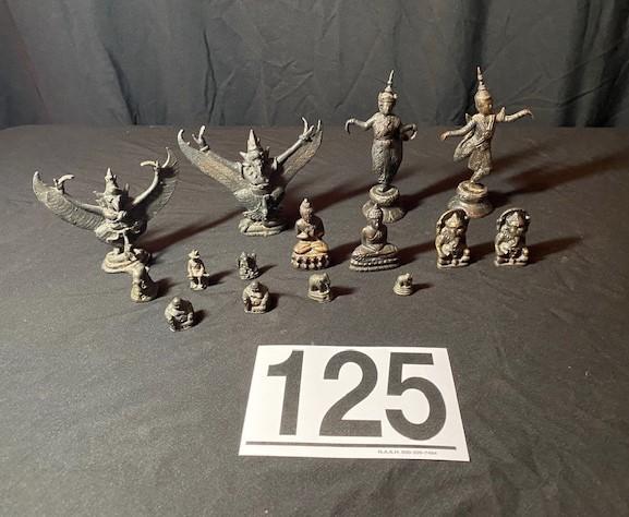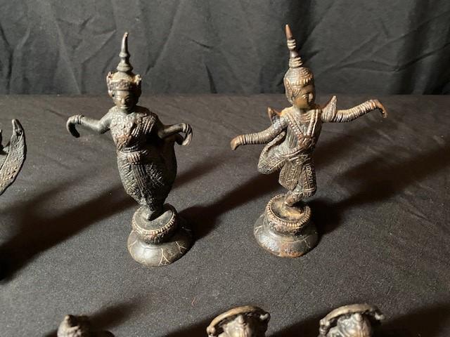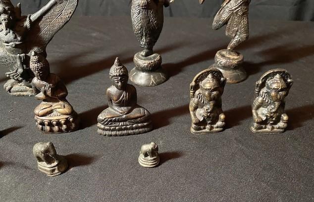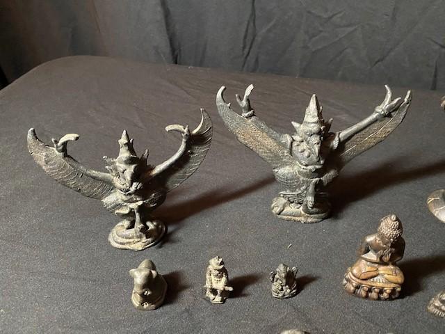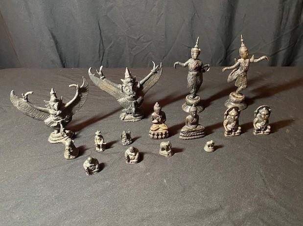 Assorted bronze and brass items. Includes: elephants, Buddhas & Thai dancers. Estimated weight of lot: 8lbs. Measurement: 5 3/4"H (tallest; dancer; each) | 5 1/4"W (widest; winged Buddha; each)