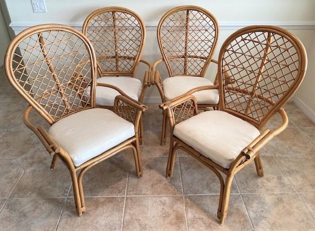 4 chairs. Sturdy. Vintage. Stains on cushions. Measurement: 43"H x 19"W x 19"D (each)