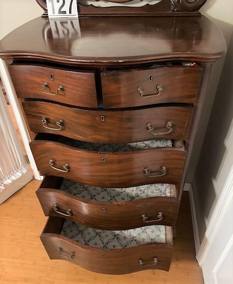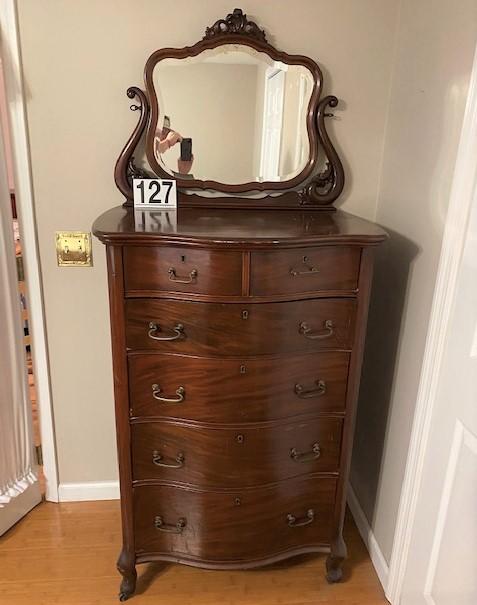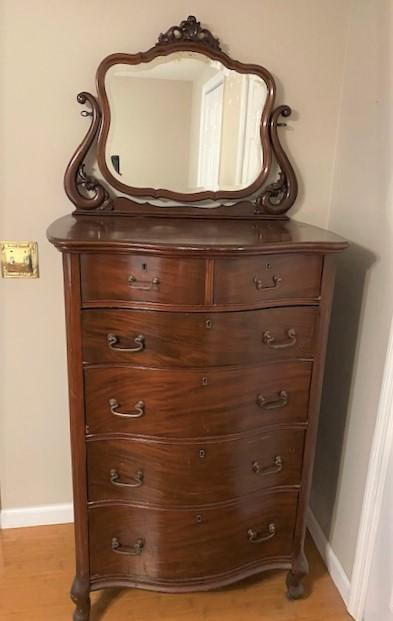 2 pieces. On casters. 6 drawers. Rococo style mirror. Estimated total lot weight: 100lbs. Measurement: 74"H (with mirror) x 33 1/2"W x 22"D