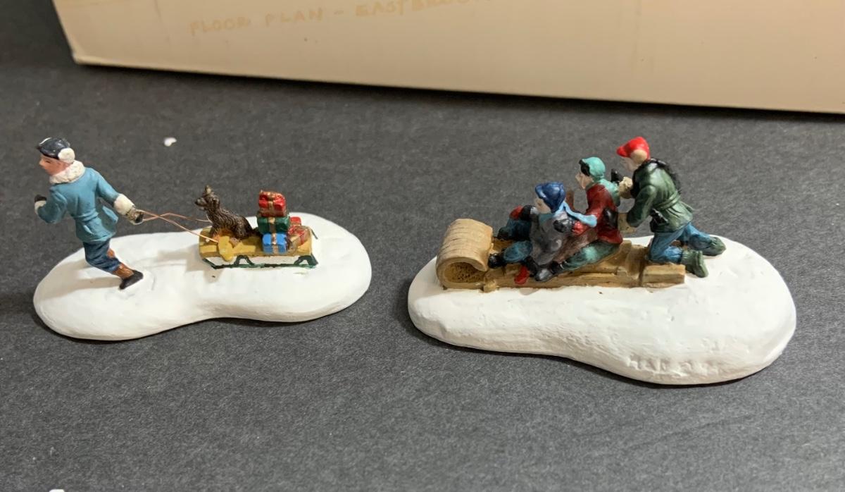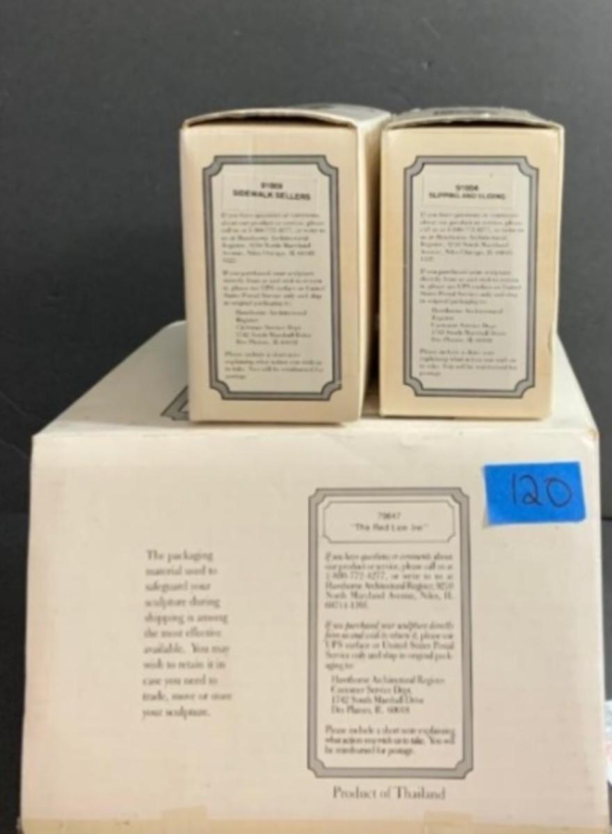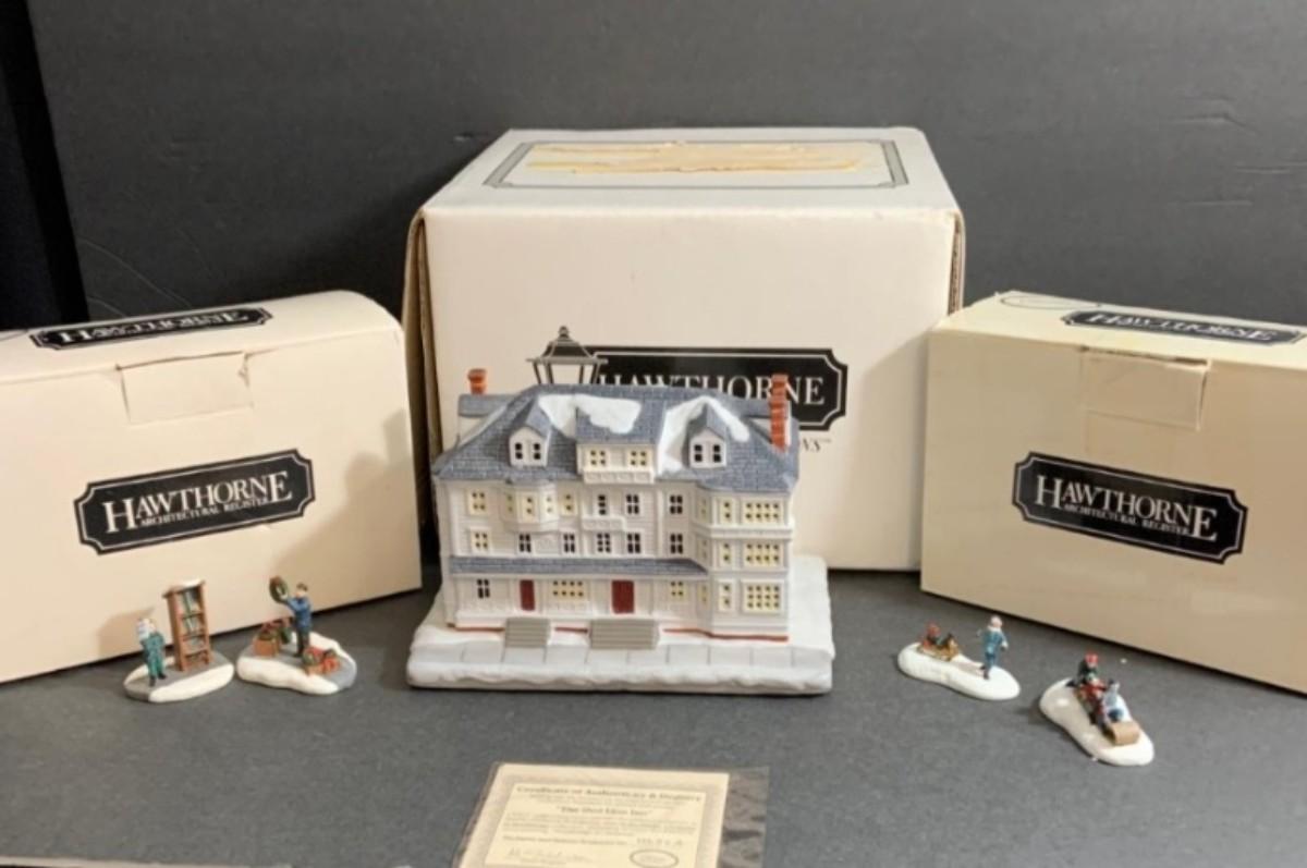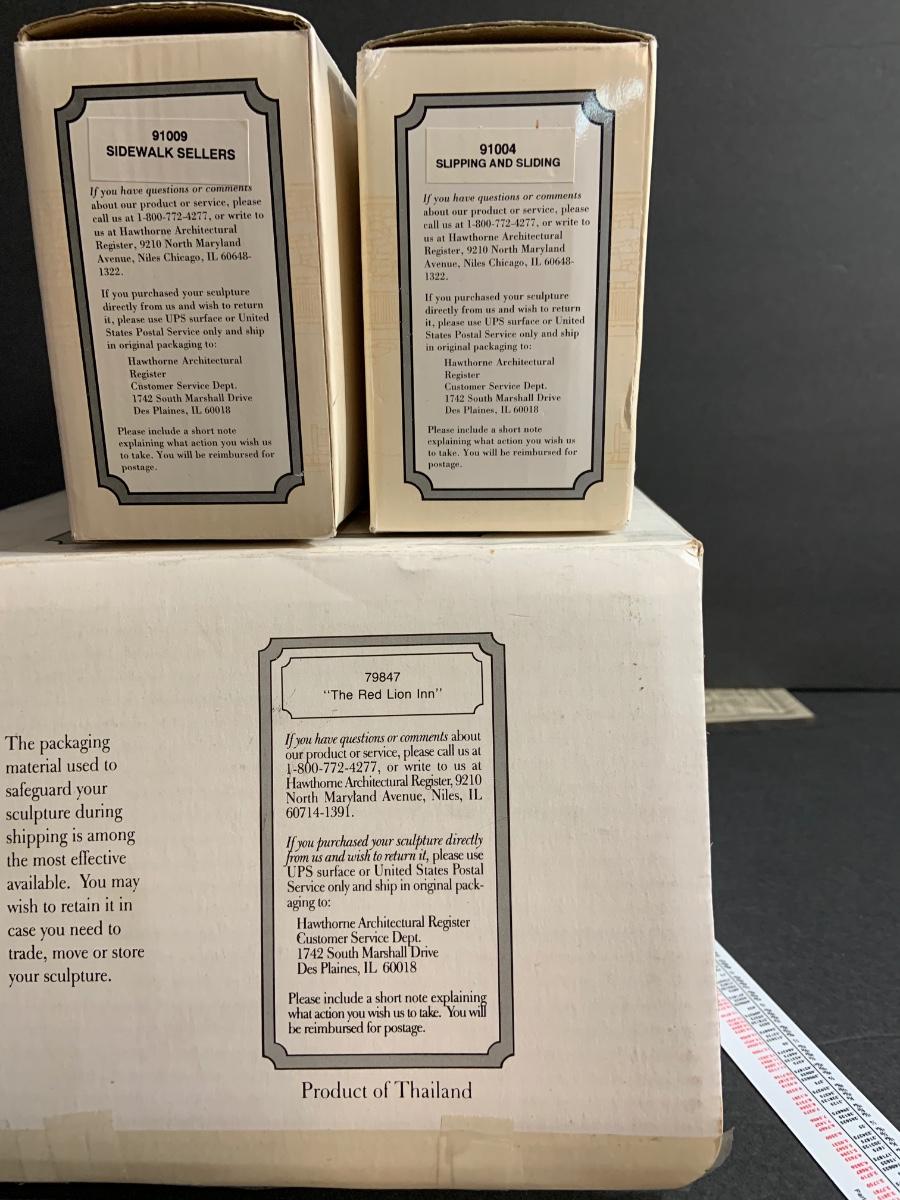 Lot:120: Lot of Hawthorne Village pieces- Christmas in Stockbridge Collection " The Red Lion Inn", Sidewalk Sellers and Slipping and Sliding