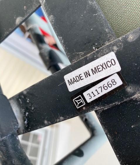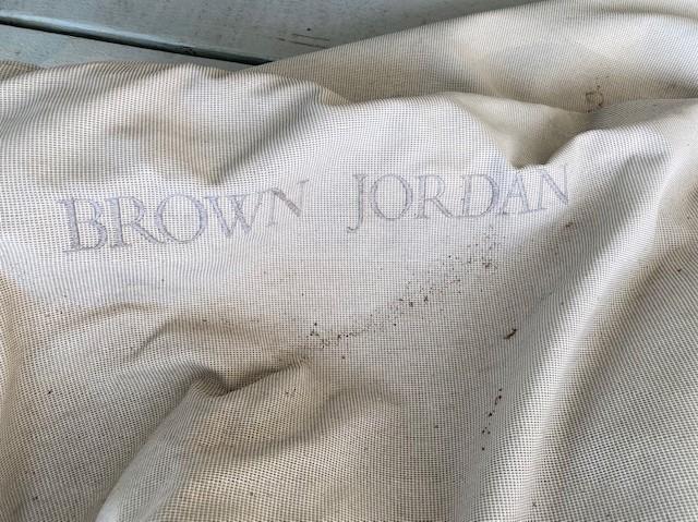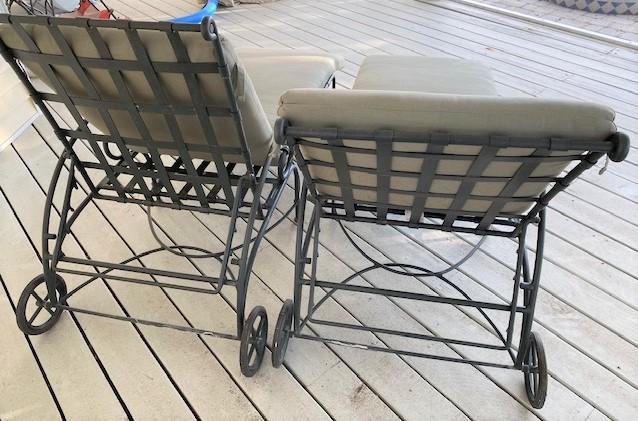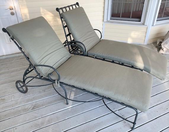 Cast aluminum. Adjustable. Cushions weathered. With covers