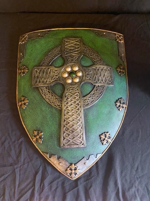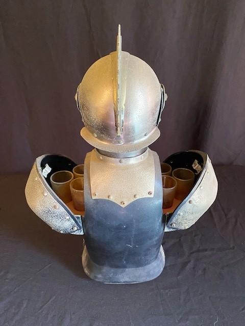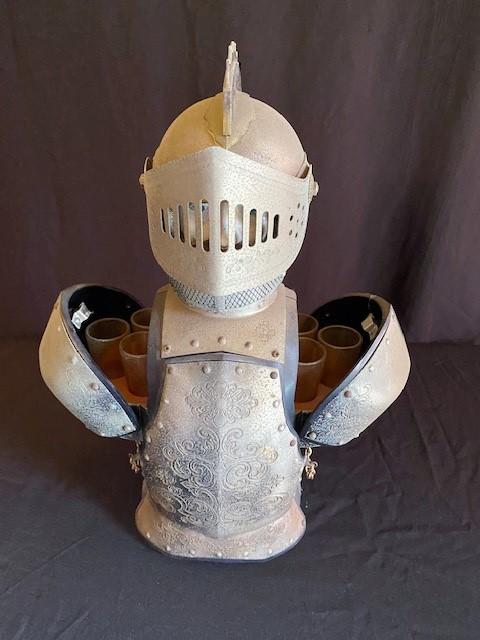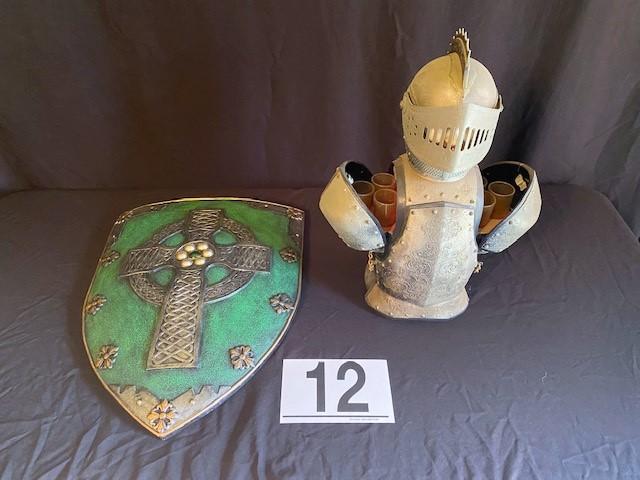 Includes shield wall décor and metal knight shot glass holder. Measurement: 16"H (knight) 14"W (shield)