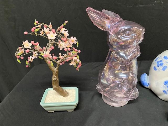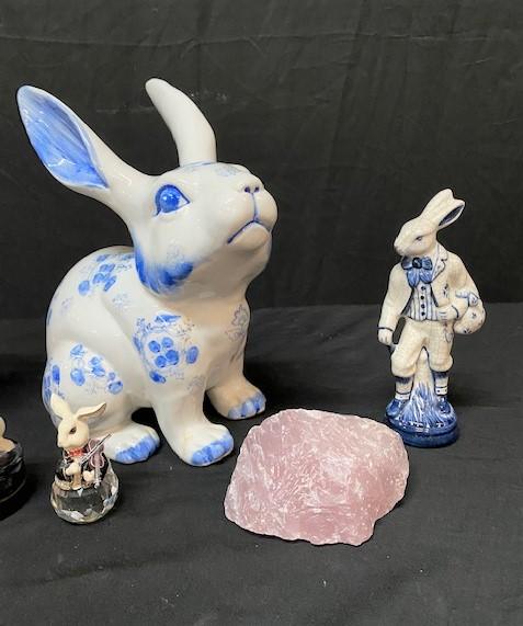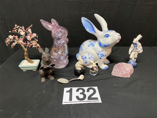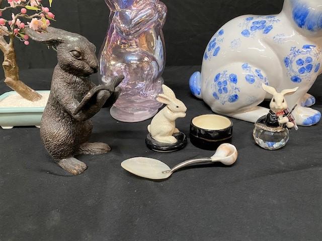 Glass, ceramic, metal rabbits. Also includes jade tree, shell spoon, quartz, etc. Estimated total lot weight: 15lbs. Measurement: 11"H x 10 1/2"L (largest)