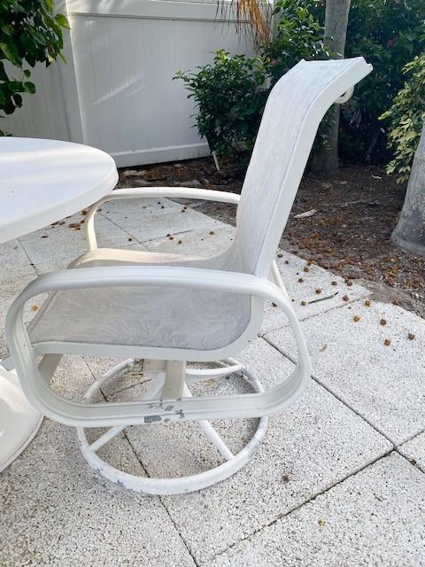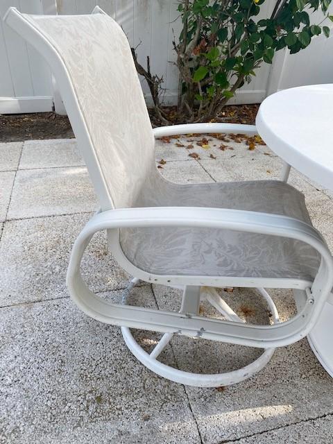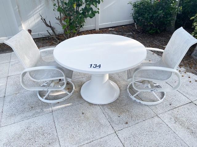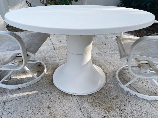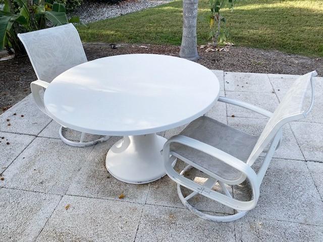 Includes two swivel chairs. Chairs are aluminum and have some rust and pitting. Measurement: 47"W (table)