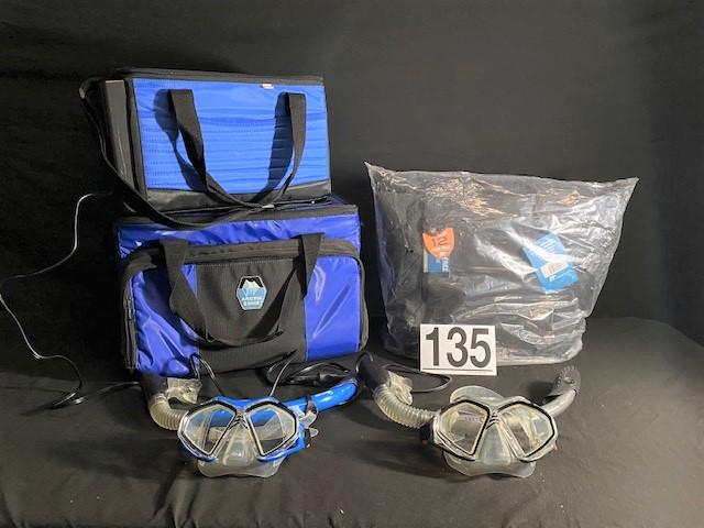 Includes: car cooler with AC adapter, ArticZone soft side cooler, NOS Polar Bear refrigerator bag, 2 Aqua Lung masks & 2 snorkels.