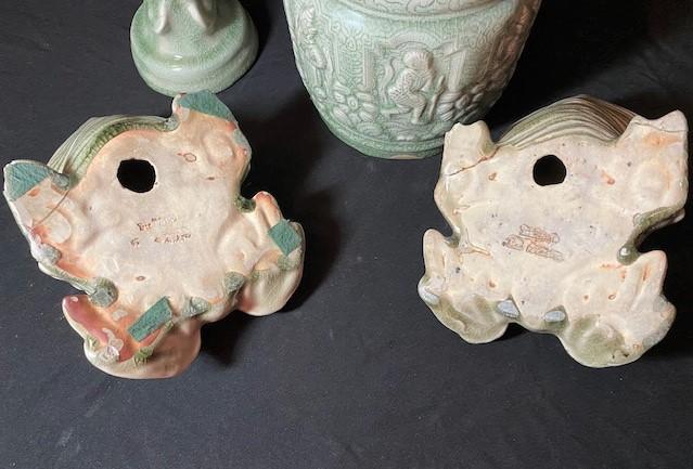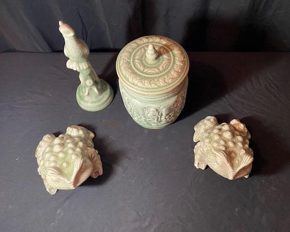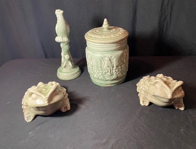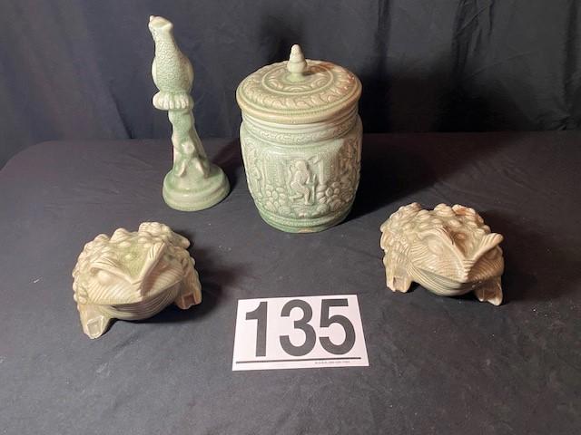 Feet have been repaired on frogs & cracked lid on jar. All signed. Estimated weight of lot: 8lbs. Measurement: 10 1/2"H (tallest; bird) | 6 1/2"W (widest; jar)
