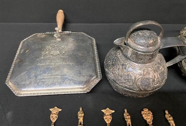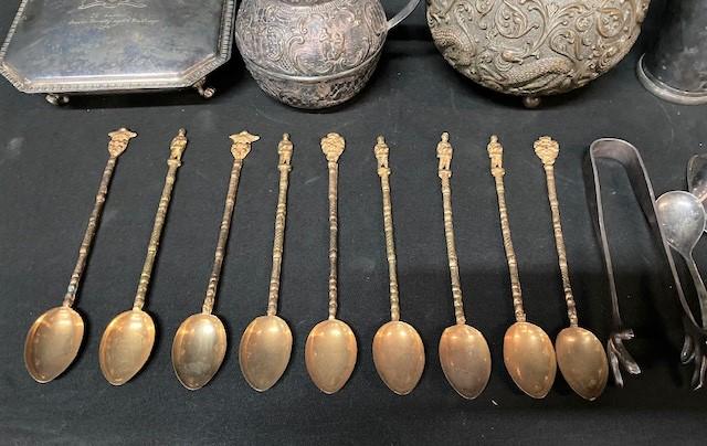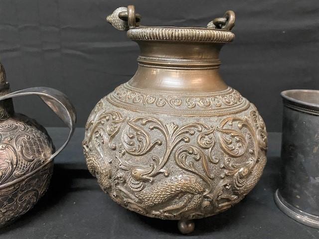 Including: silver-plate flatware, gold-plated stirring spoons, copper pot & silver-plate kettles. Measurement: 9 1/2"H (teapot) 6 1/2"W (pot with dragons)