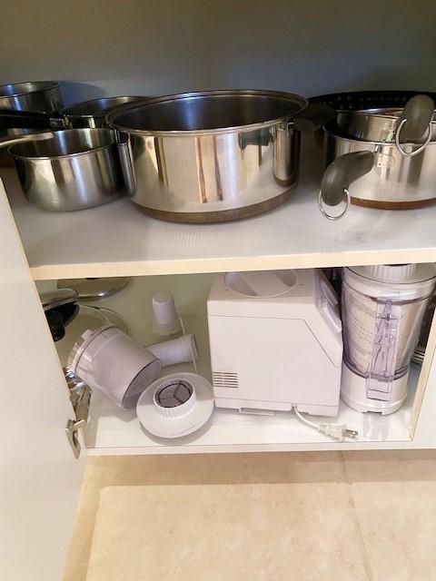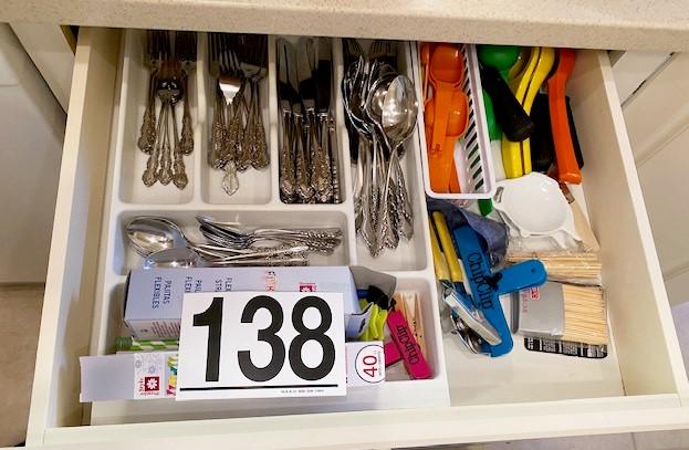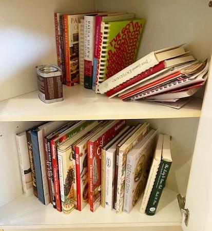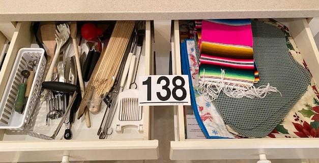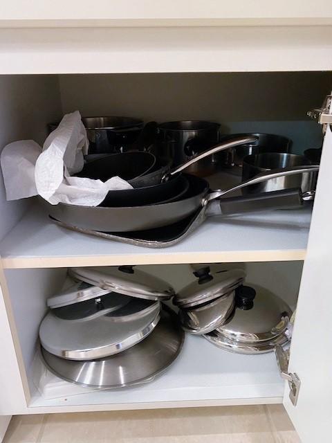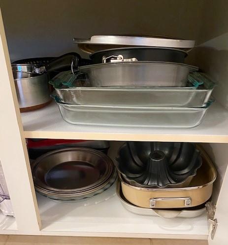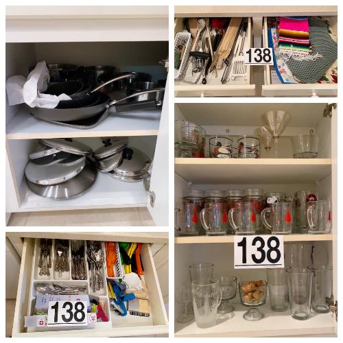 Contents of 10 cabinets and 7 drawers. Includes: glasses, cookware, dishware, pots, pans, cook books, utensils & more.