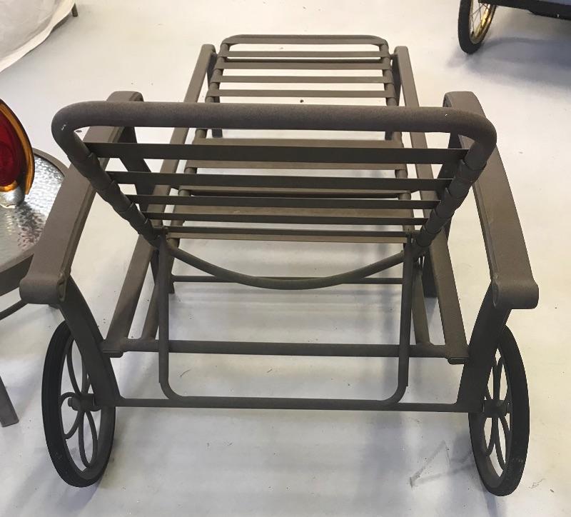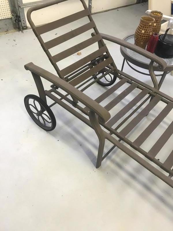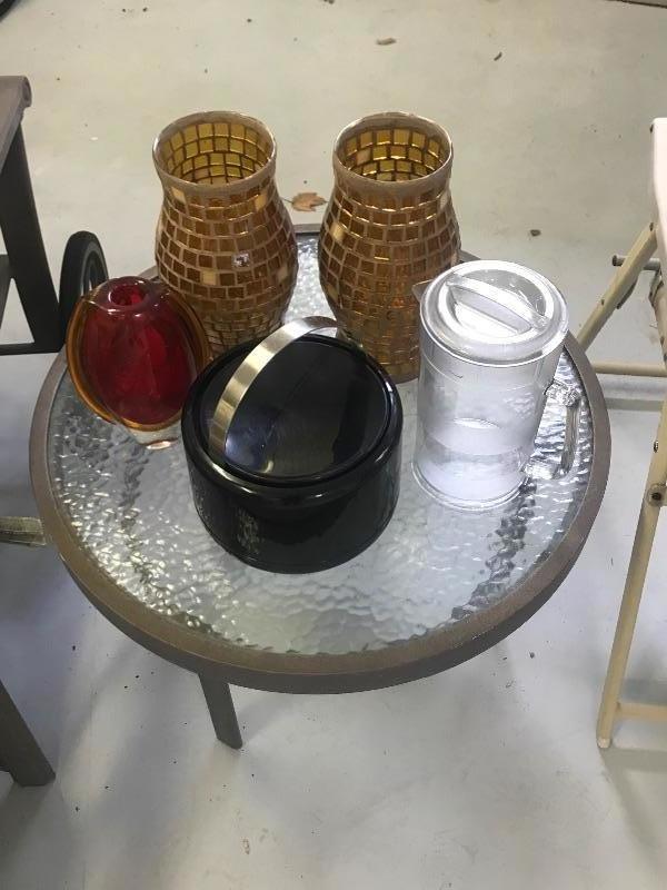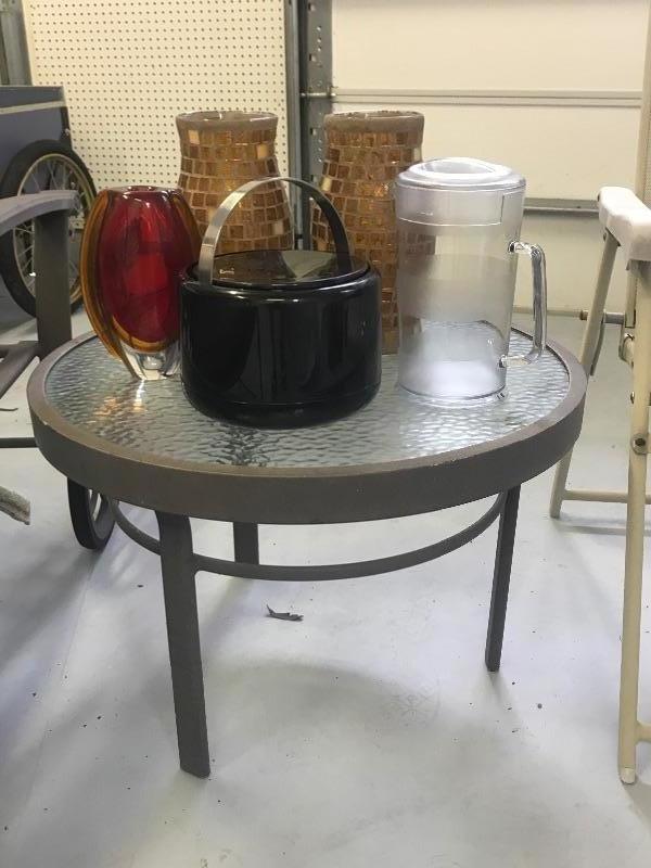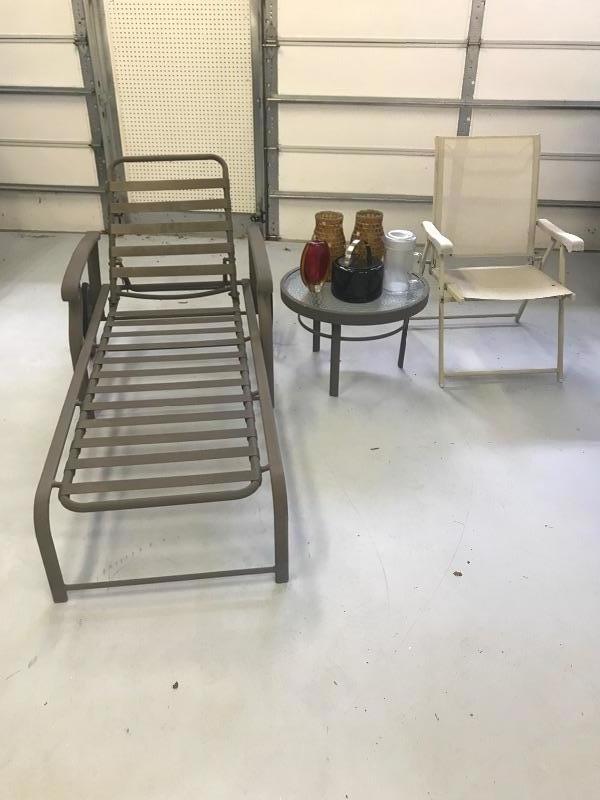 Outdoor furniture includes a reclining lounge chair (no cushion), folding chair and small round table. Pair of mosaic hurricane globes ,plastic H2O pitcher , Stelton ice bucket with lid and decorative vase. Table measures 24-1/2” diameter and 16-1/2” tall