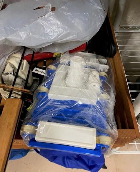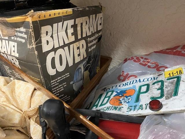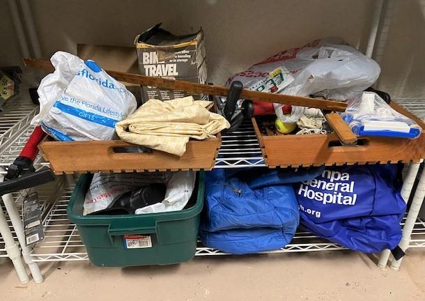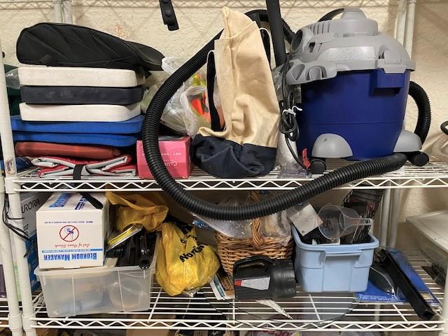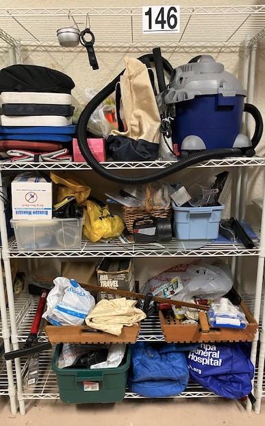 You get everything seen including shelf. Includes shop vac, seat cushions, some crafting, pool supplies, and more. Estimated weight of lot: lbs. Measurement: