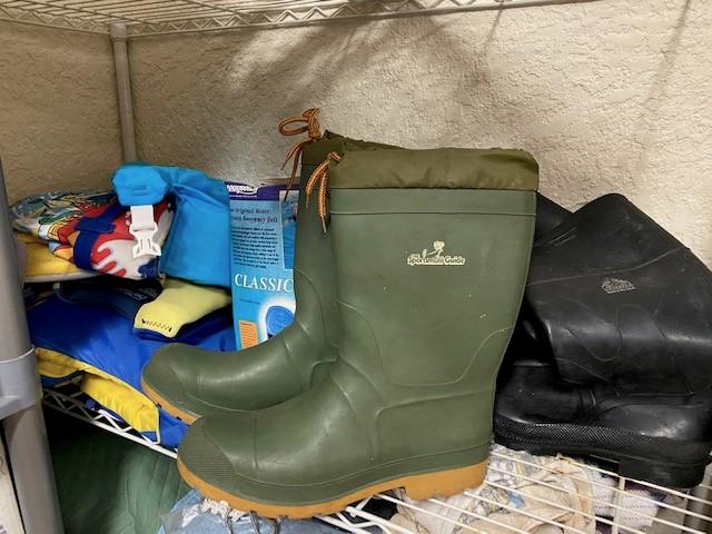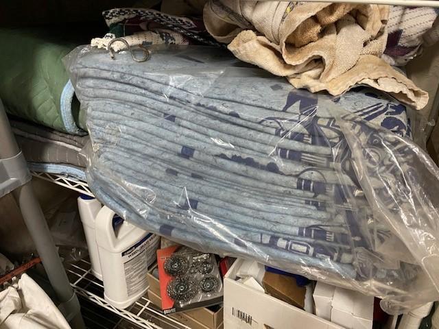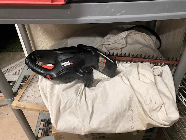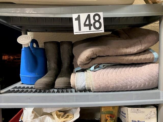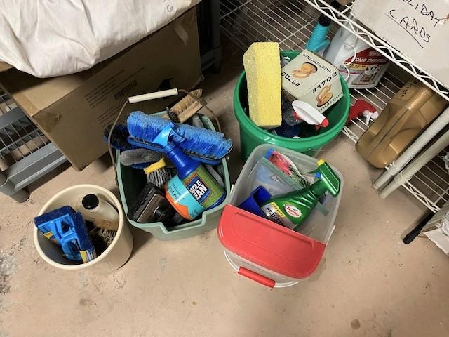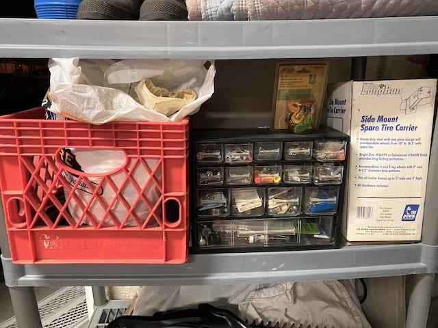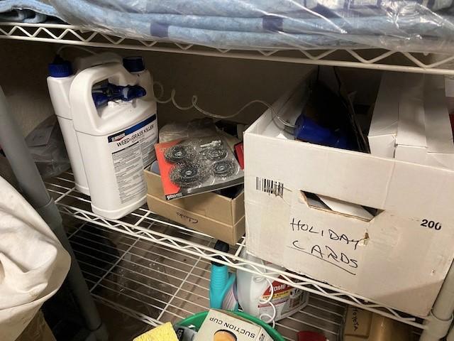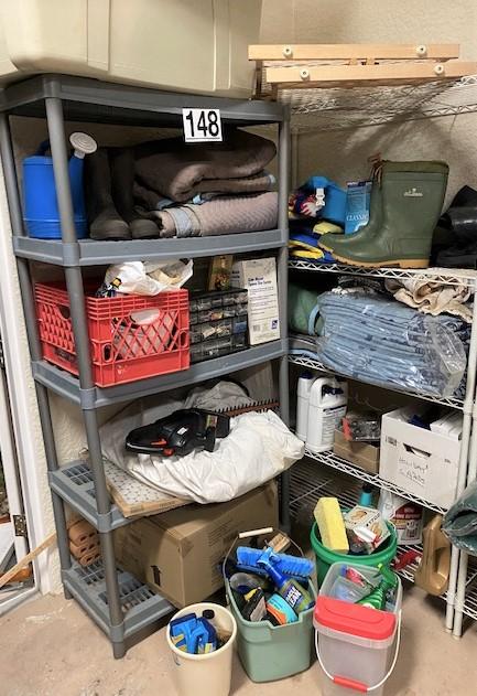 You get everything seen including two shelves. Includes boots, cleaning supplies, moving blankets, hedge trimmer (untested), car care, bug spray, and more.