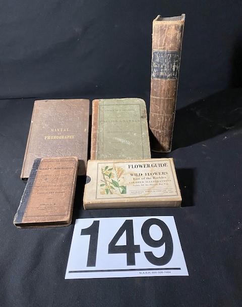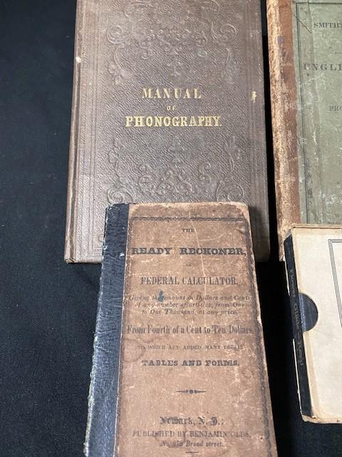 Subject matters include: phonography, flowers, Wilson's Human Antamony medical book, calculator,Smith's New Grammar books. Some foxing. Publication ranges 1844 - 1926. Estimated weight of lot: 5lbs. Measurement: 9 1/2"L x 6"W x 4 1/2"H (all stacked together)