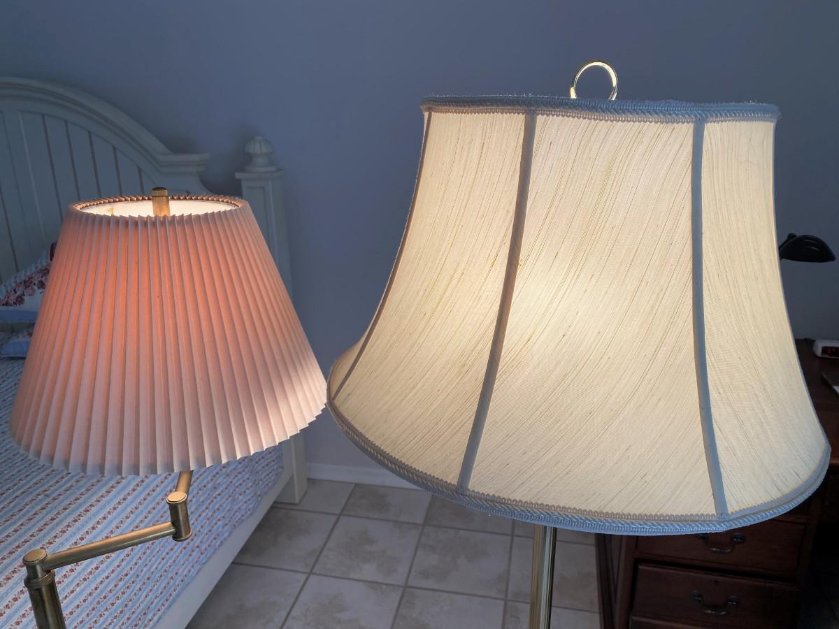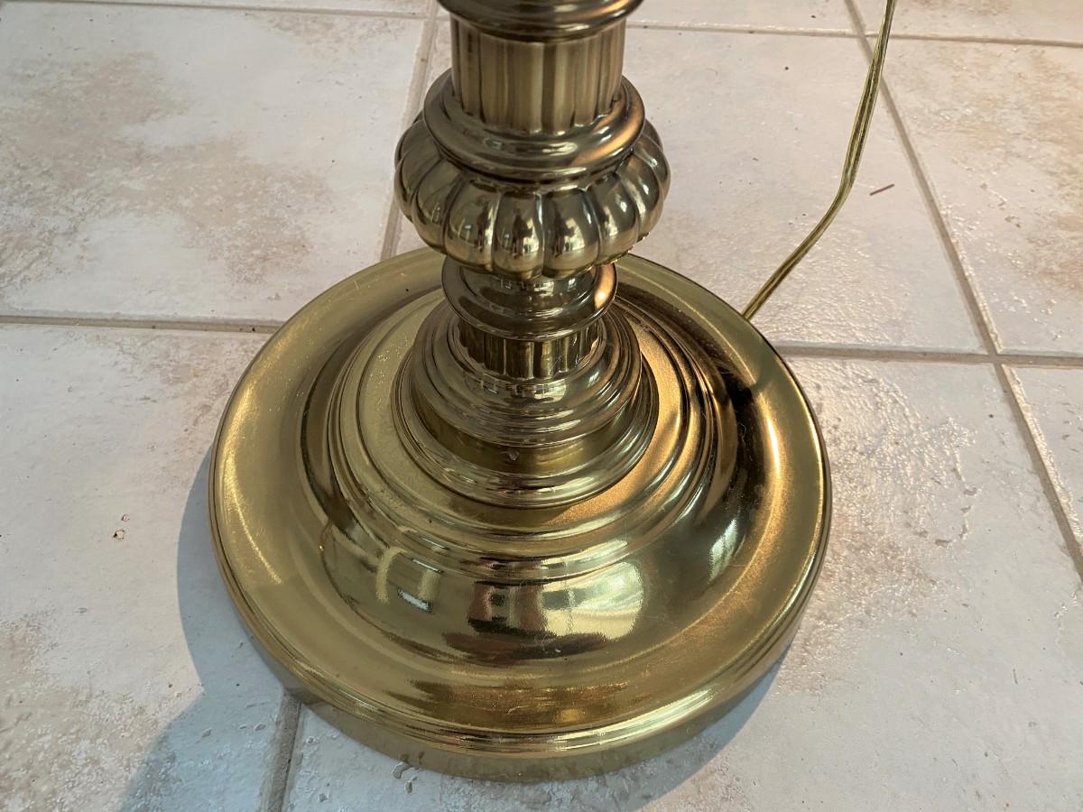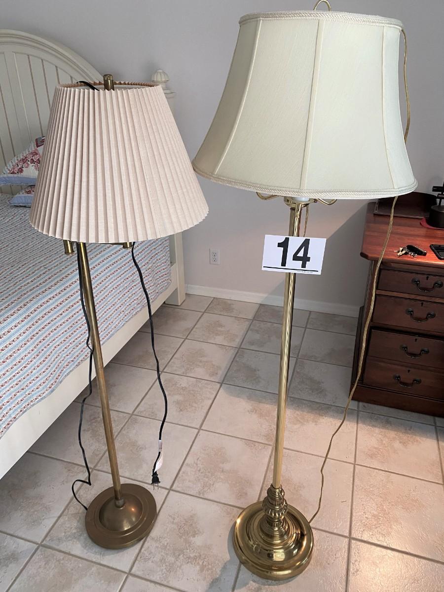 Two brass floor lamps. Both working at time of cataloging. Measurement: 62"H x 18"W (tallest)