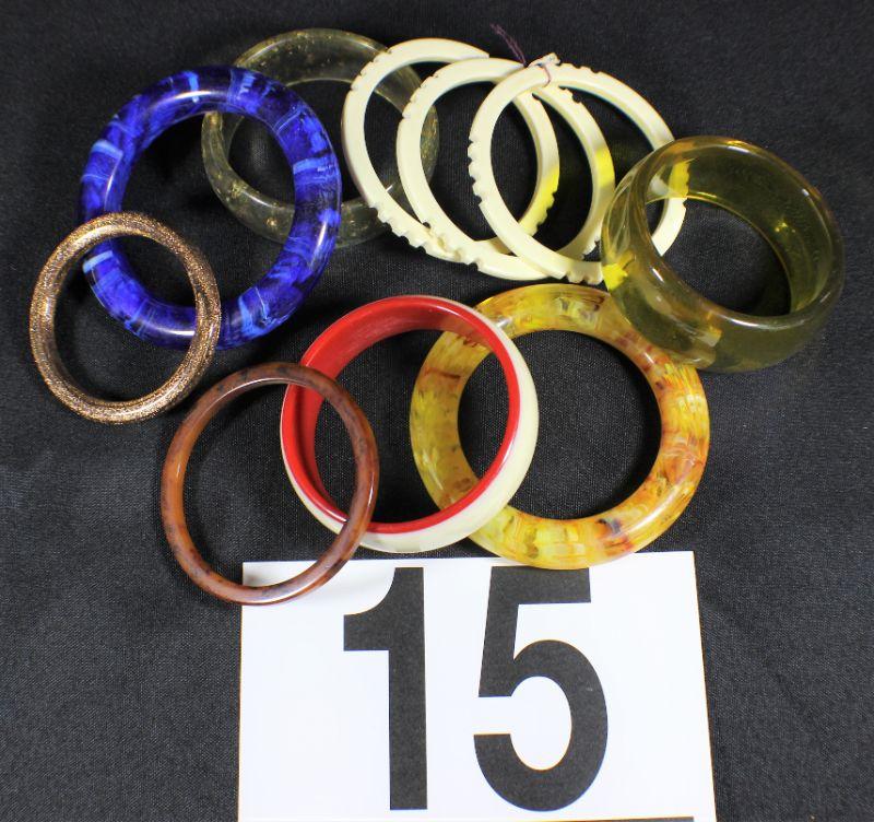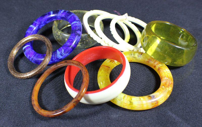 Various wrist sizes, manufactures. Plastic & Resin. Possibly Lucite.