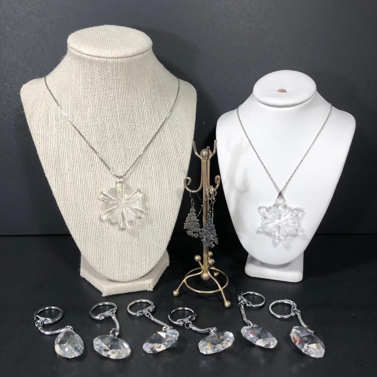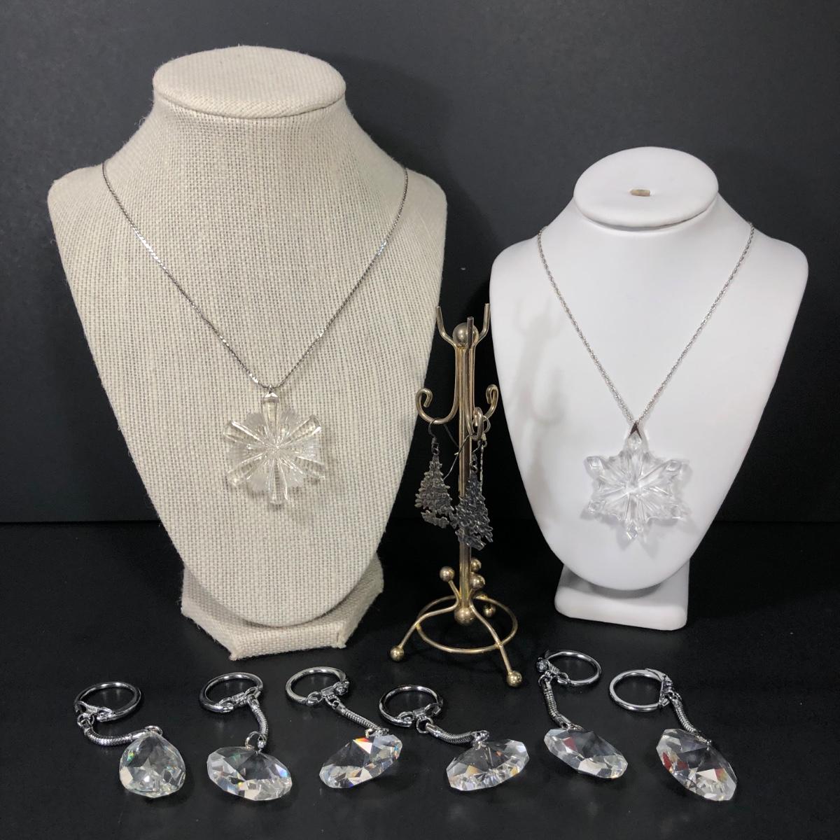 LOT151M: Crystal Snowflake Necklaces, Silver Toned Pierced Earrings & Crystal Keychains