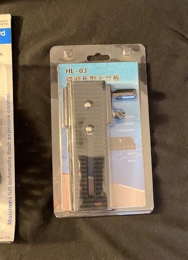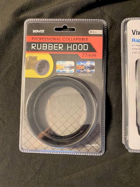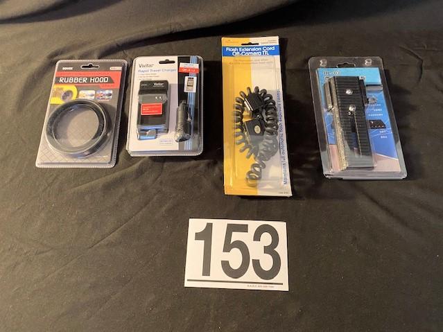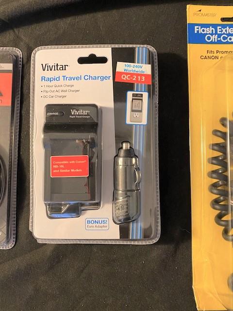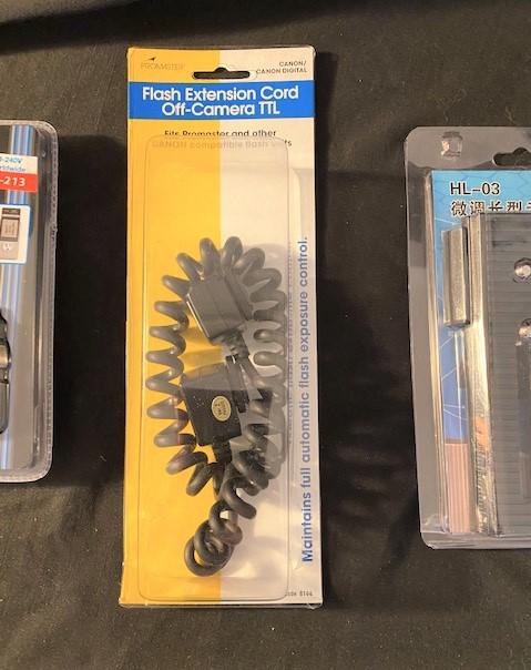 Rubber hood, rapid travel charger, flash extension cord & more. Estimated weight of lot: 5lbs. Measurement: 12" x 5" (largest)