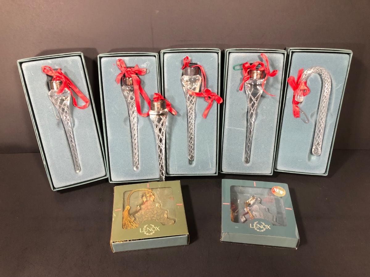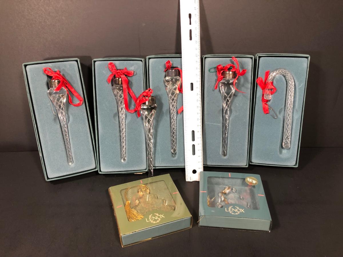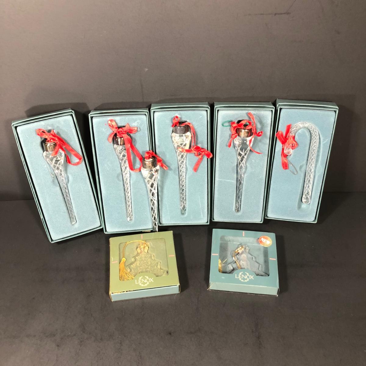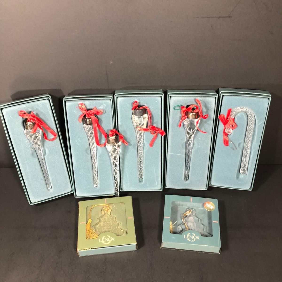 Includes 5 crystal icicle ornaments (four in box, one out of box) and a crystal candy cane ornament in its box. Also includes two Annual Tree ornaments from 1994 and 1997. All made by Lenox.