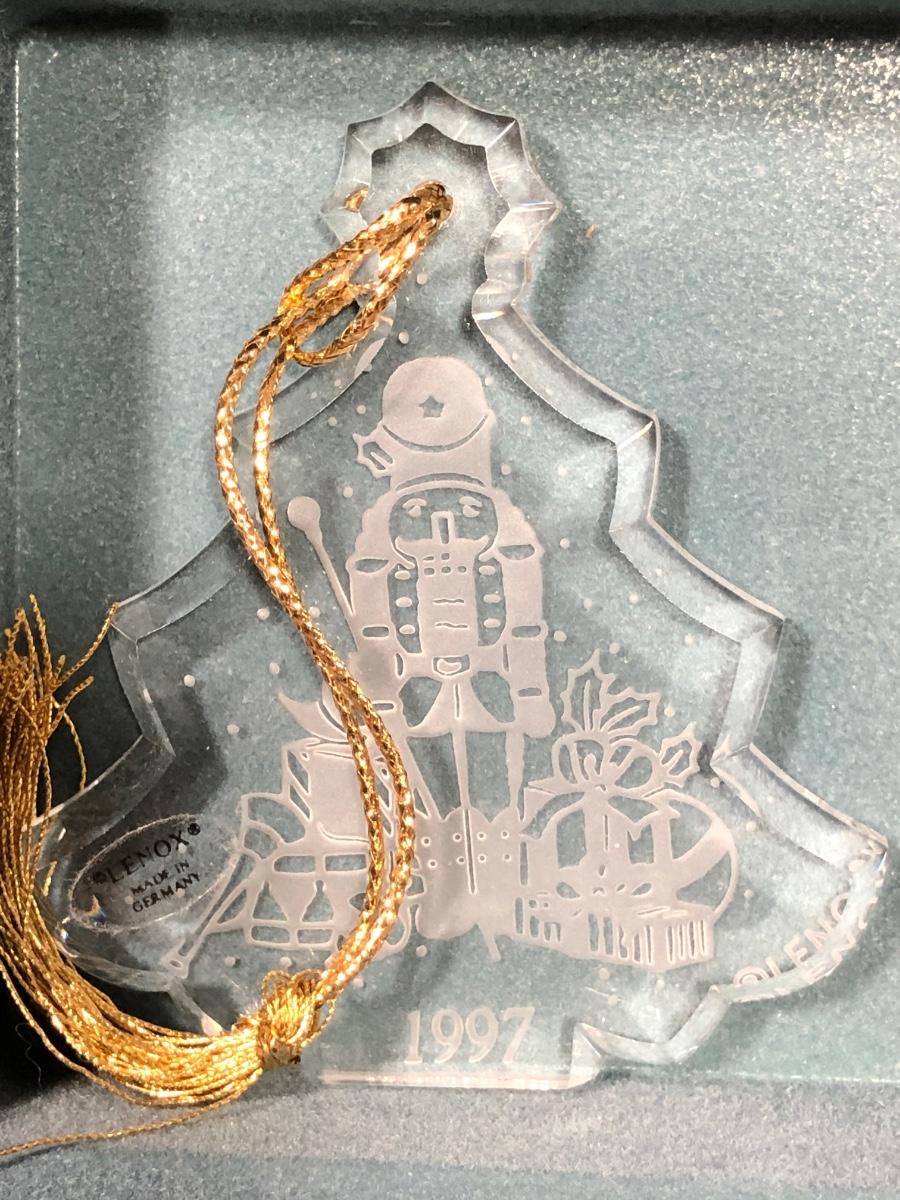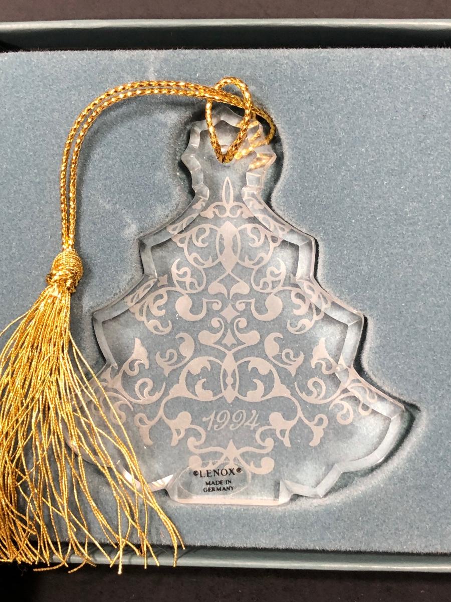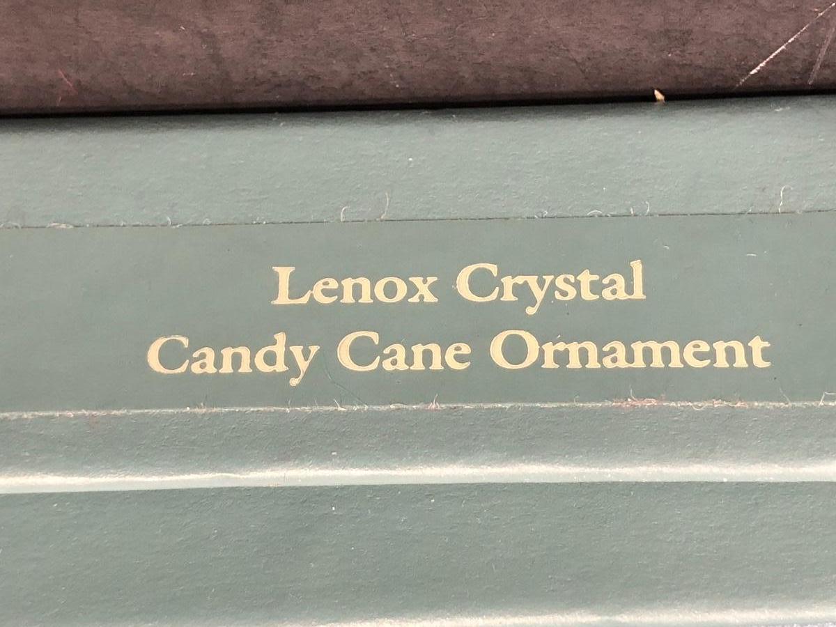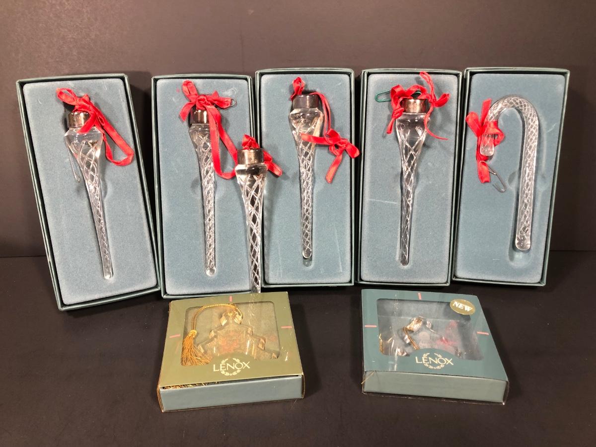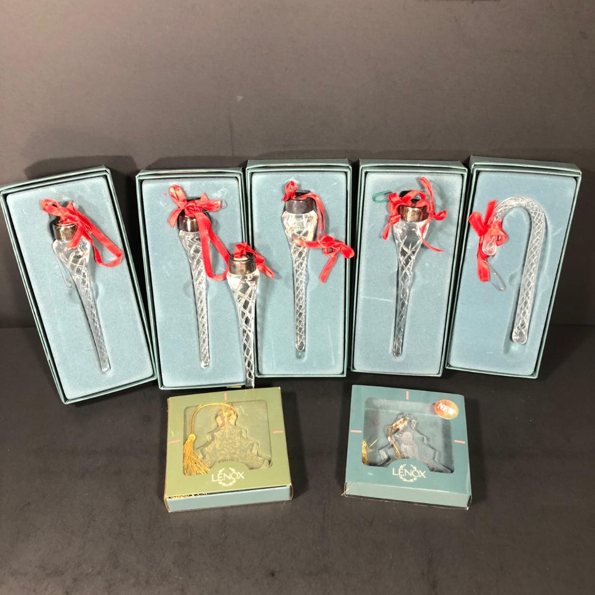 Includes 5 crystal icicle ornaments (four in box, one out of box) and a crystal candy cane ornament in its box. Also includes two Annual Tree ornaments from 1994 and 1997. All made by Lenox.