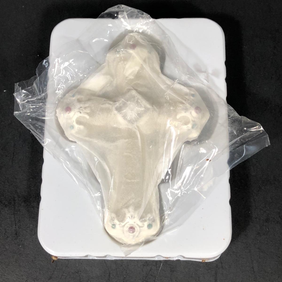 Fluted ball is from the 1990s. Silverplated Mesh Cross Ornament with Jewels has been removed from box, but not unwrapped.