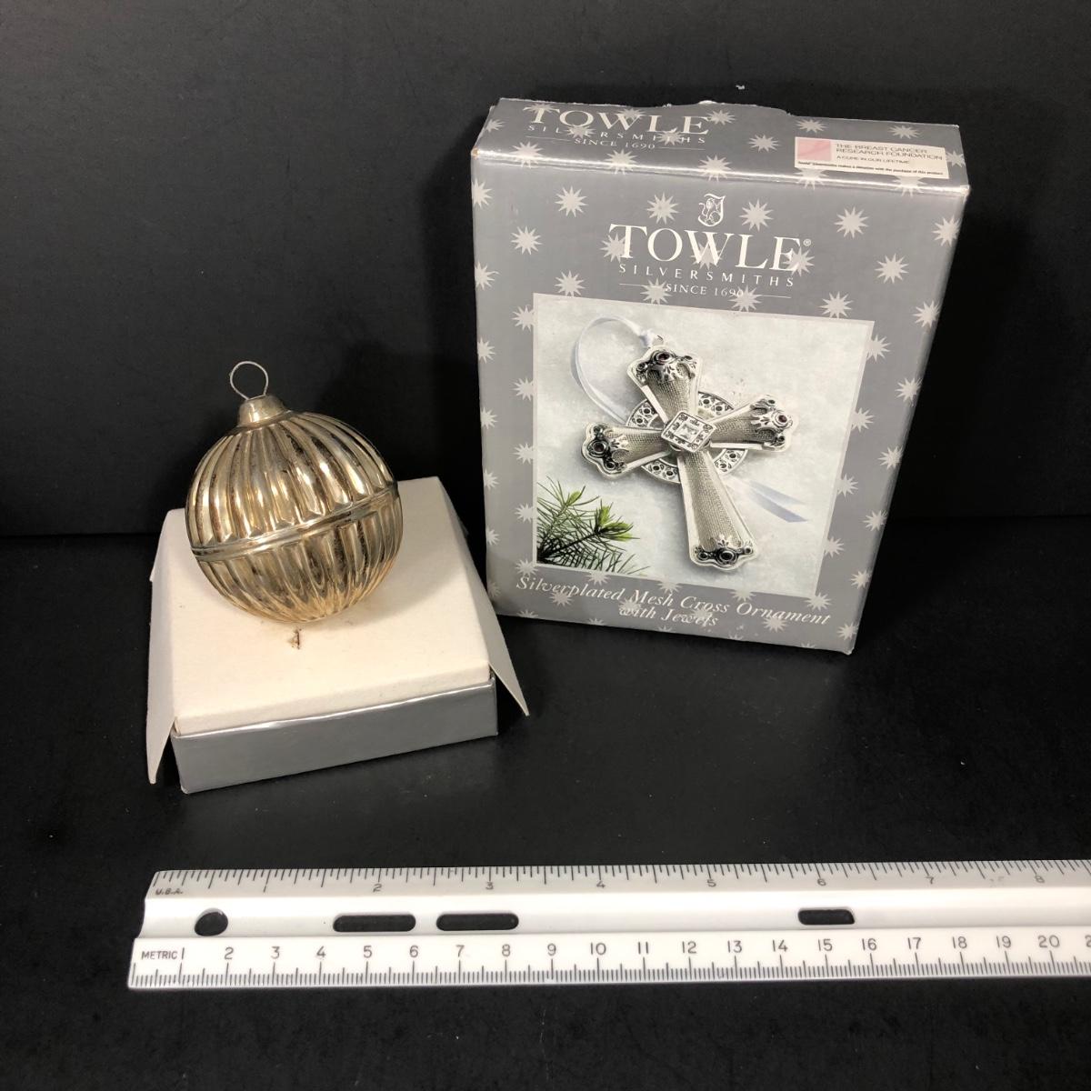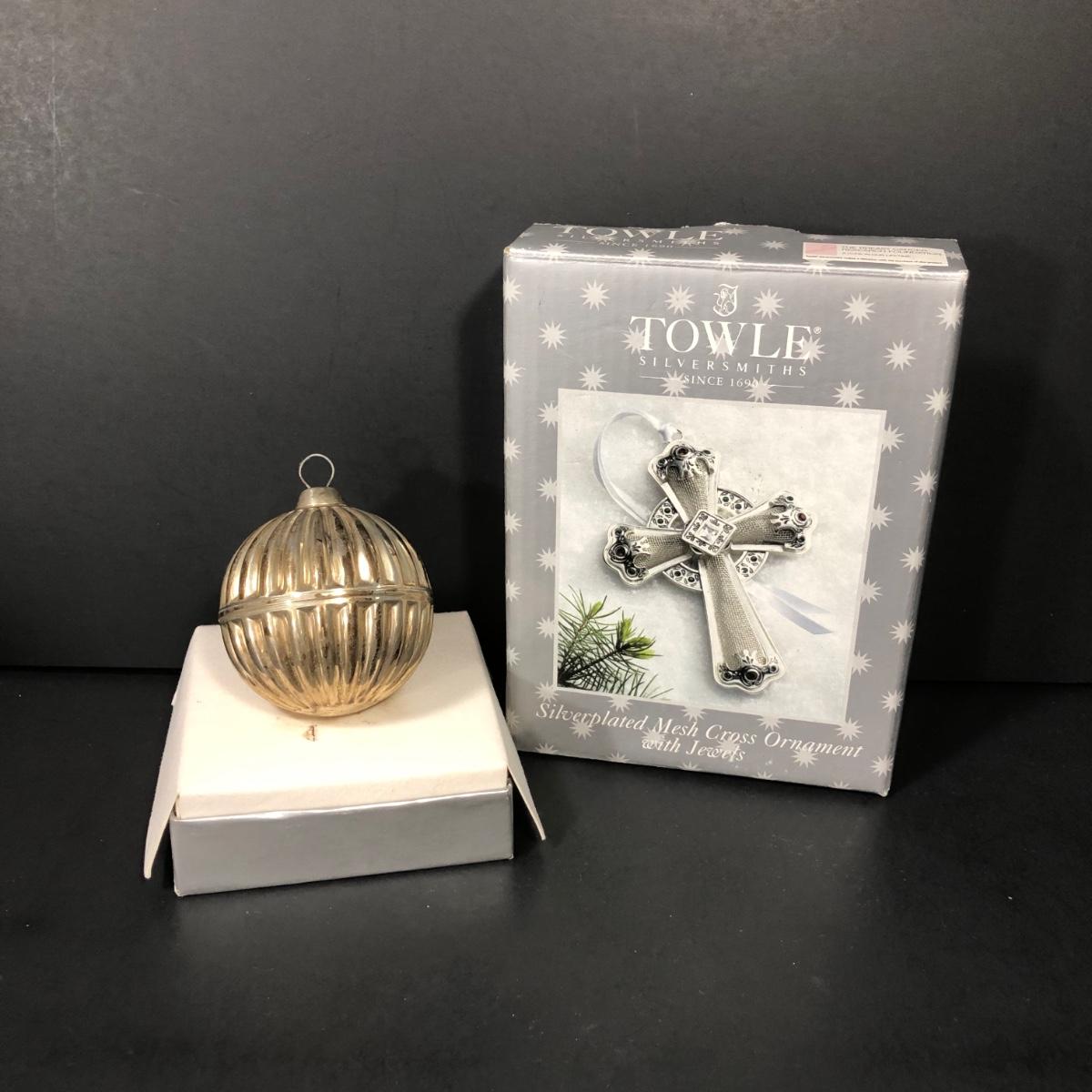 LOT155: Towle Sterling Silver Fluted Ball & Silverplated Mesh Cross Ornaments