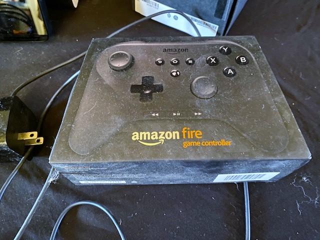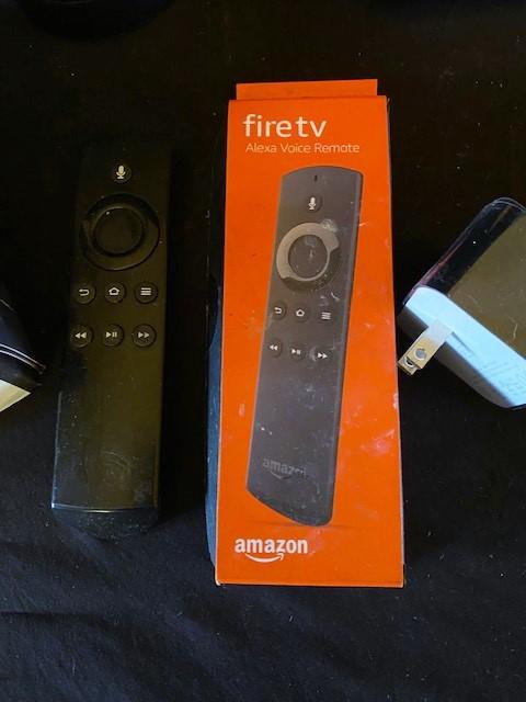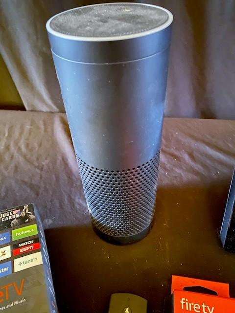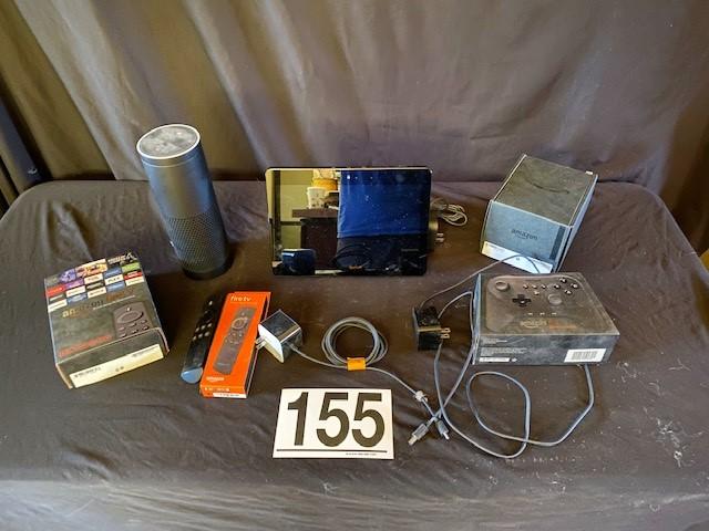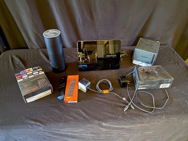 Includes Amazon Fire game controller, Amazon Echo speaker and display, and Amazon Fire TV cube with 3 voice remotes. Not all pieces tested. Echo working at time of cataloging.