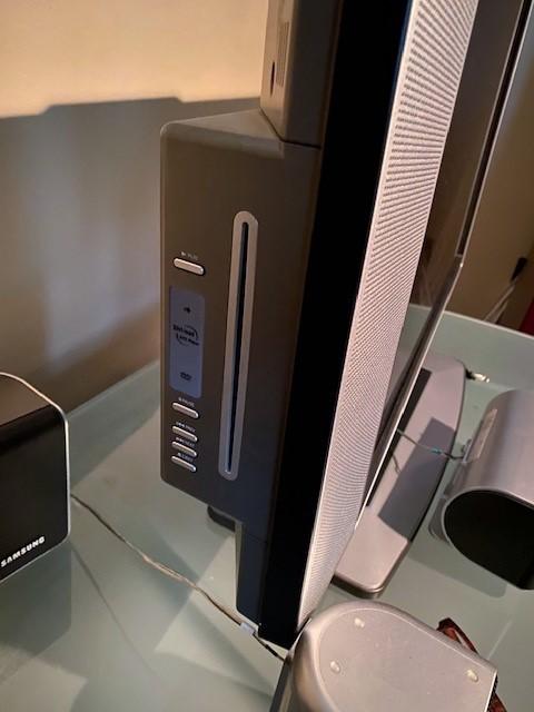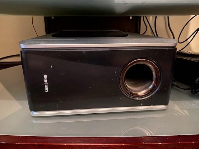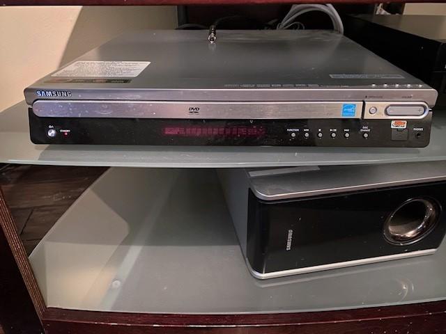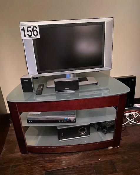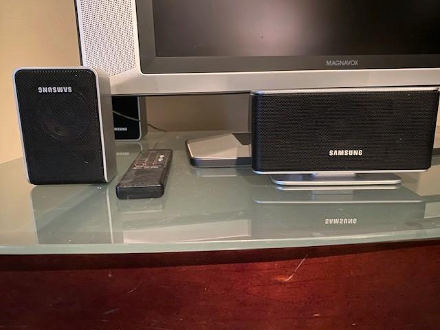 Includes Magnavox TV, stand, Samsung 4-piece speaker system, and Samsung DVD player. Speakers and DVD player power on at time of cataloging. TV does not power on at time of cataloging. Measurement: Stand: 40"W x 23"D x 24"H