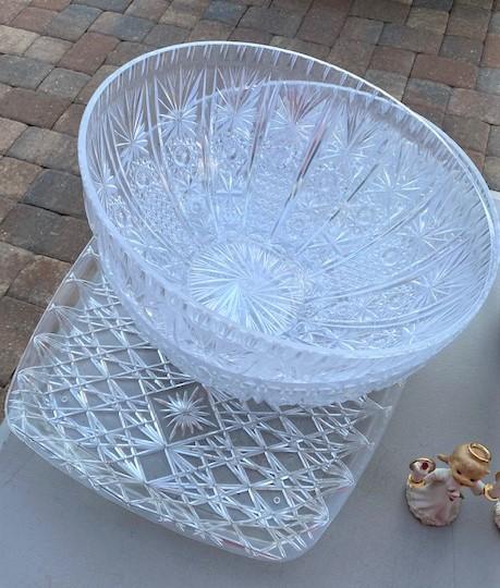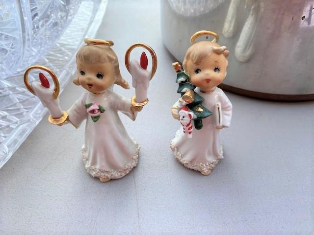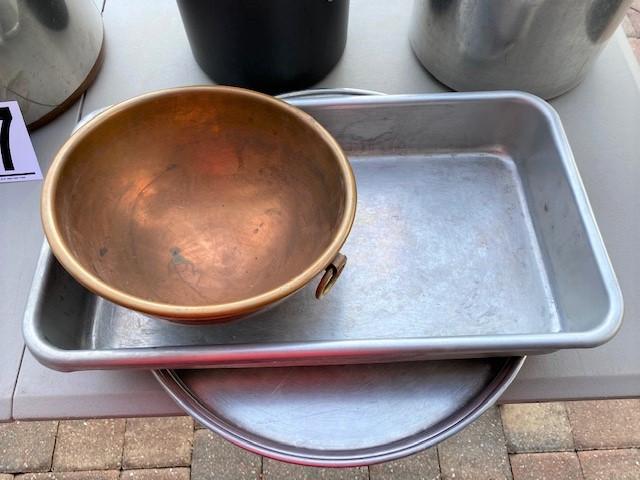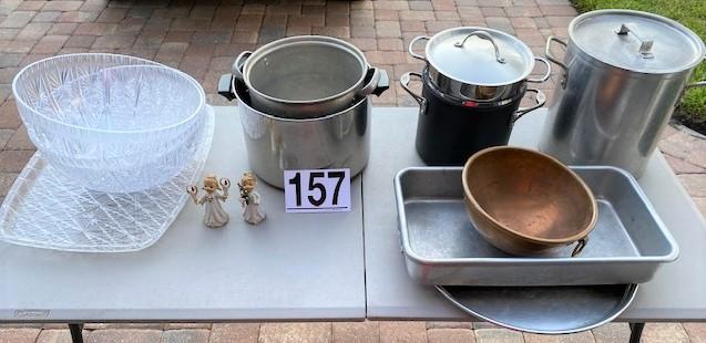 Stock pots, steamer pot, heavy copper mixing bowl, water bath, plastic punch bowls, server & Lefton Angels.
