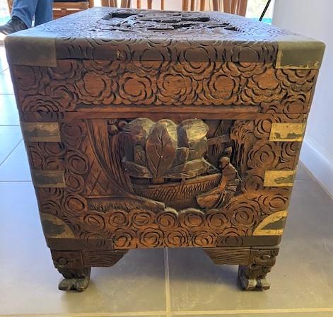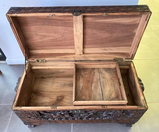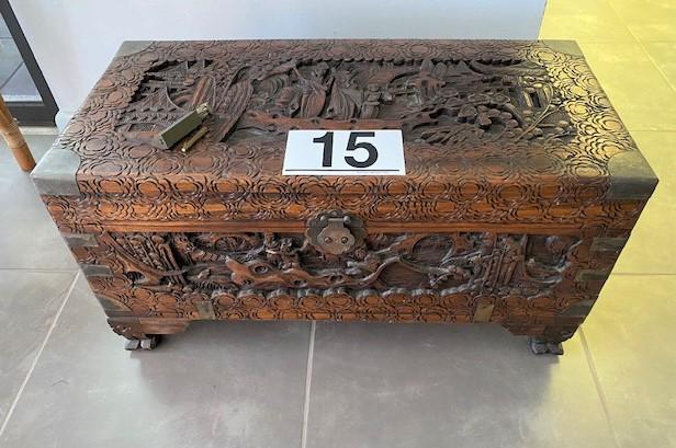 LOT#15D: Ornately Carved Camphor Wood Chest w/ lock & Key