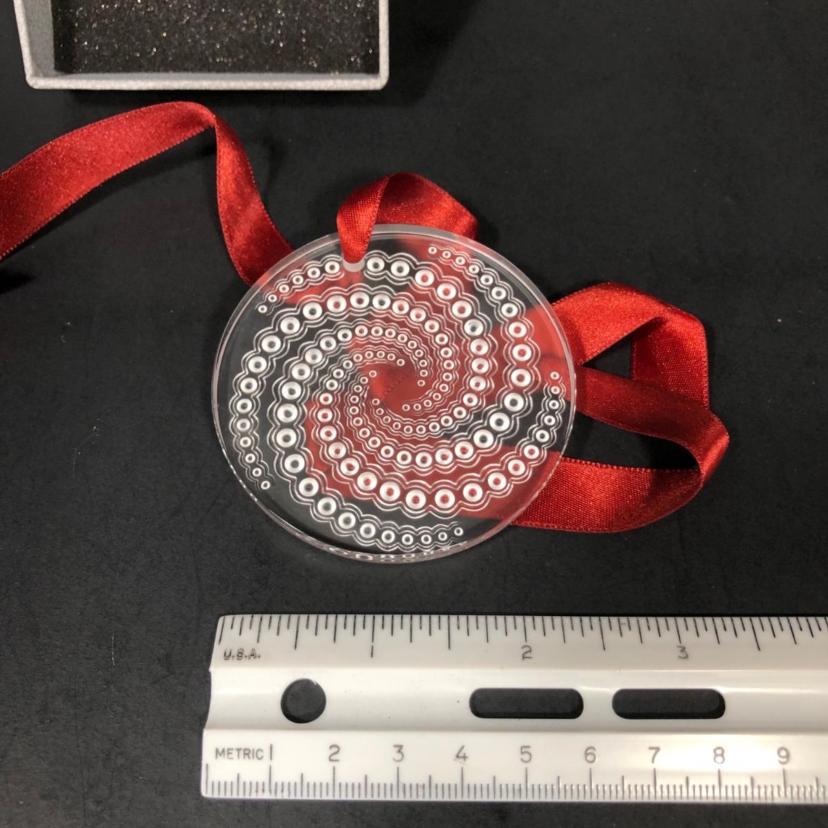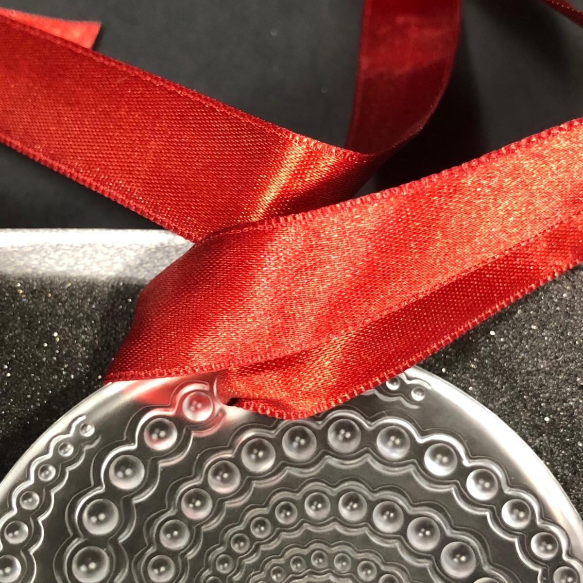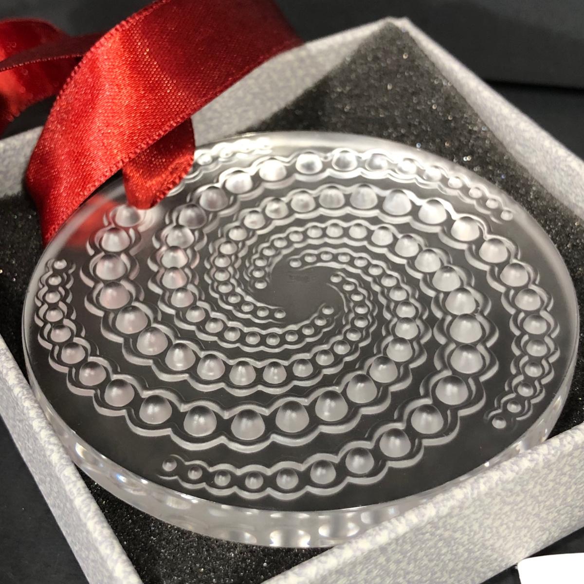Includes one clear crystal ornament with red ribbon made by LaLique in Paris, France.