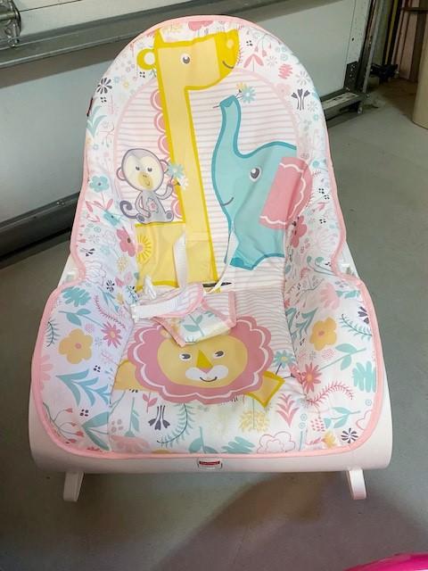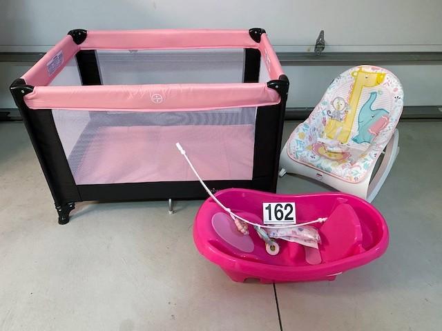 Includes: bathtub, Fisher Price rocker & play pen. Measurement: 40" x 28"W x 27"H