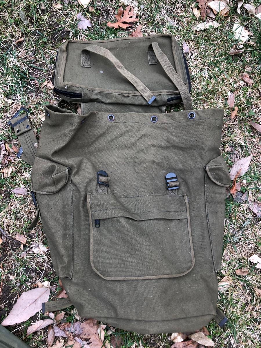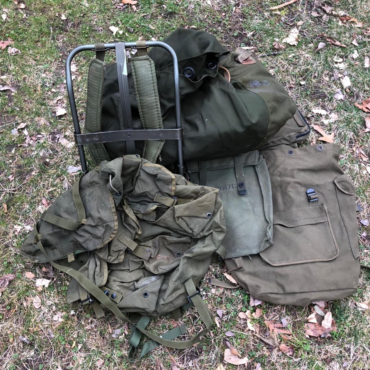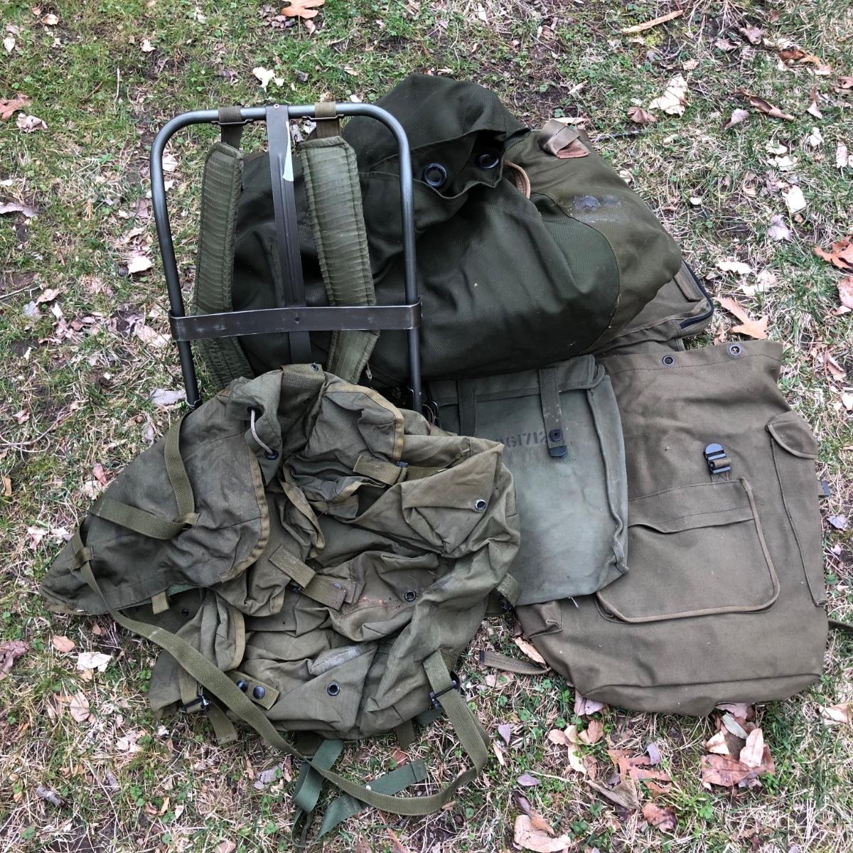 Includes an unopened US Military duffel and a variety of military bags and a back rack.