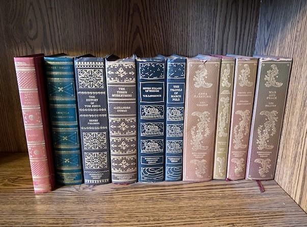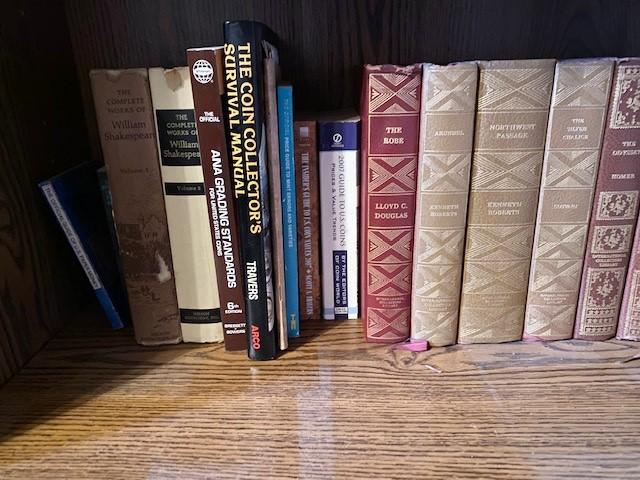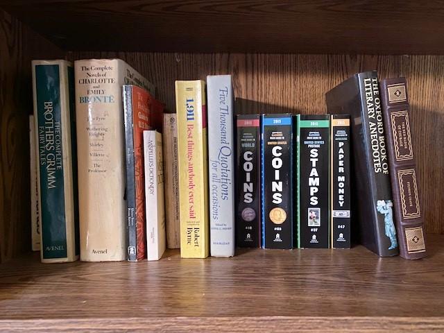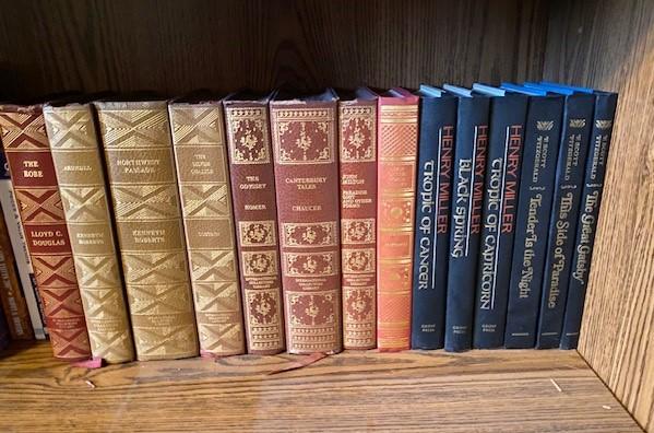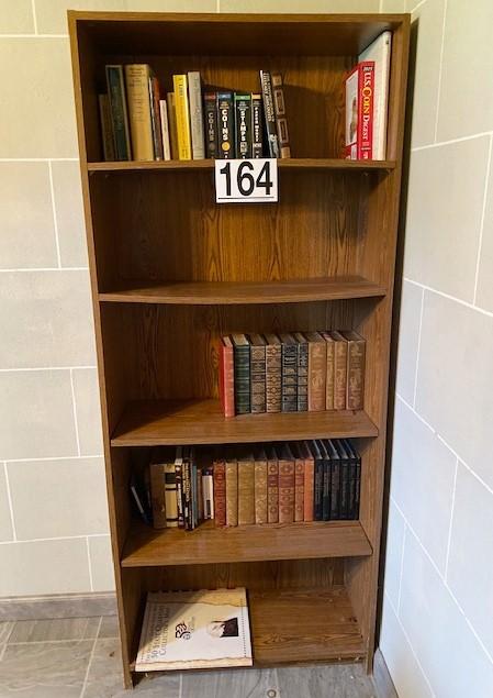 Pressed wood composition shelf. 40+ books. Authors include Henry Miller, Lloyd Douglas, Fielding, Dumas, and more. Measurement: 71"H x 29 1/2"W x 11 1/2"D