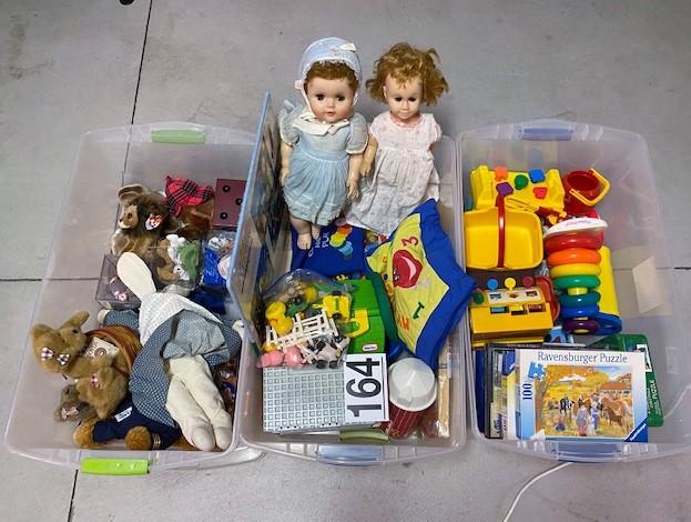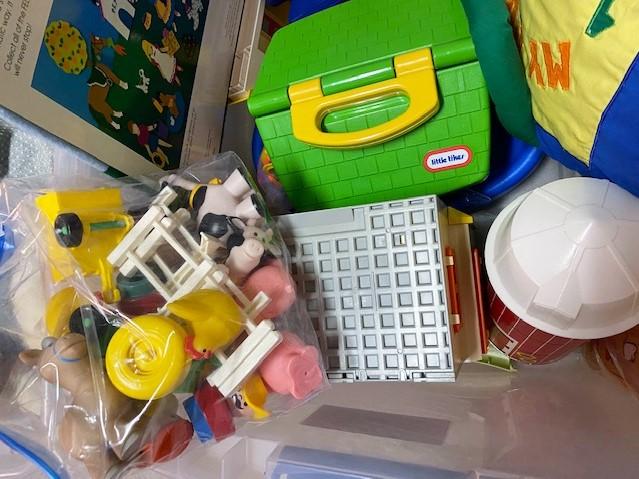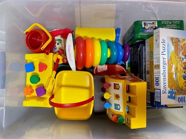 Includes: Fisher Price, Boyd's Boys, Little Tykes, puzzles, dolls & more. 3 bins worth.