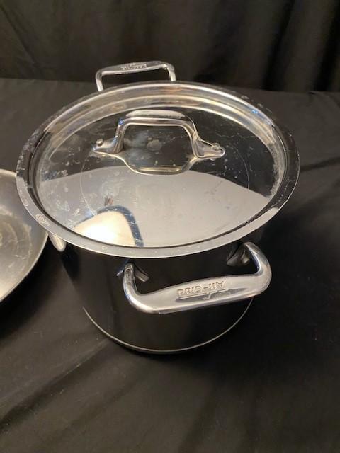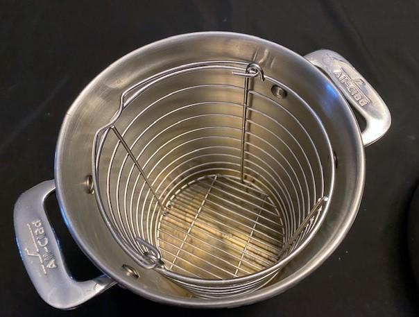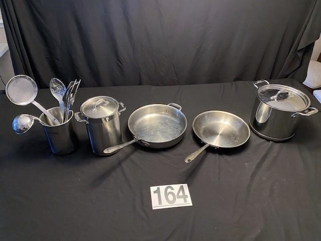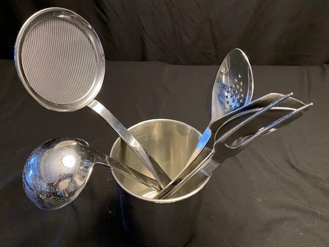 Includes two skillets, steamer, stock pot, and utensil caddy with utensils. Total of 11 pieces.