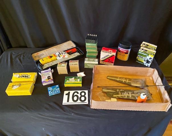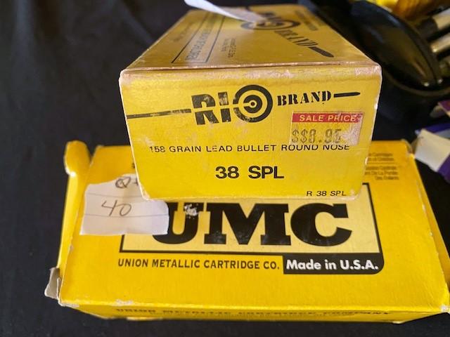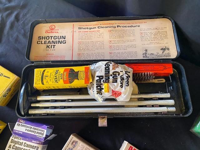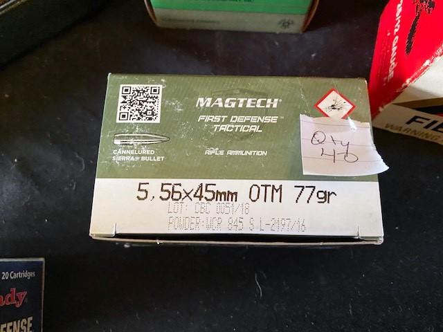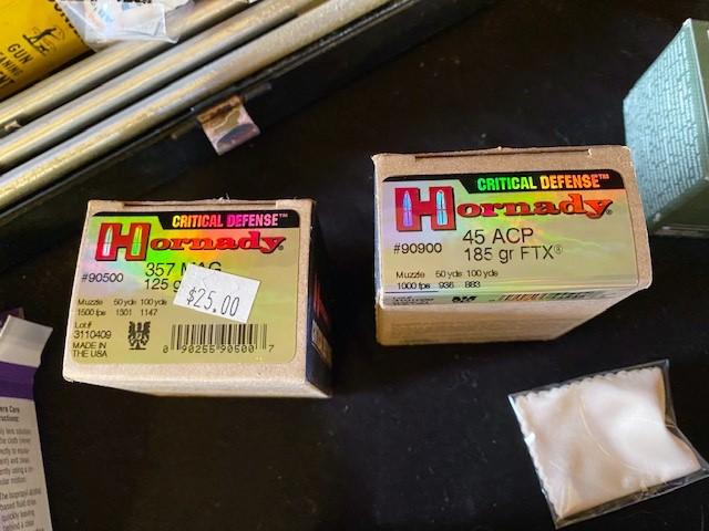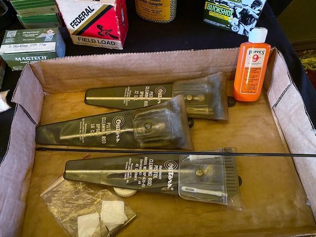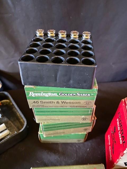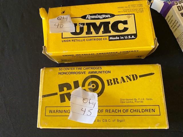 Includes 38 SPL, 357 Mag, 45 ACP, 5.56, .40, 12 gauge, Daisy BBs, and buckshot. Lot also includes gun cleaning supplies. Some boxes are open. Quantities of opened boxes are noted.