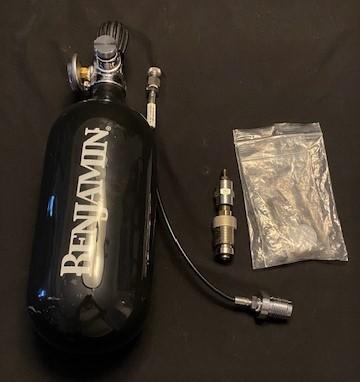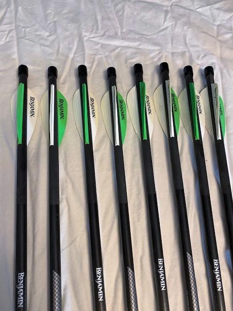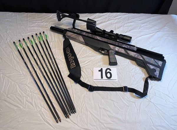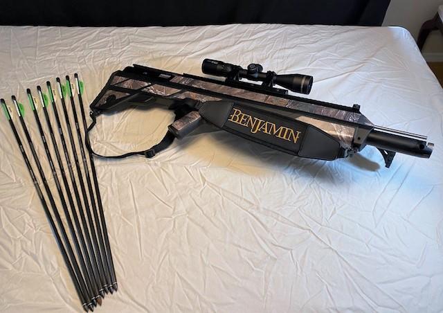 Max pressure 3000PSI. With 8 Benjamin Arrows & sight mark scope. Estimated total weight of lot: 10lbs. Measurement: 33"L x 8"W