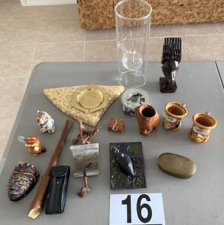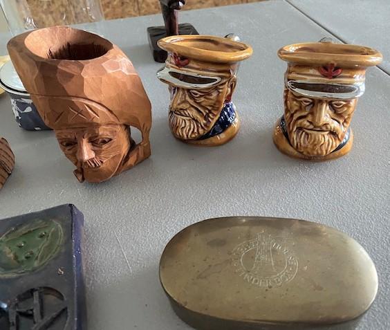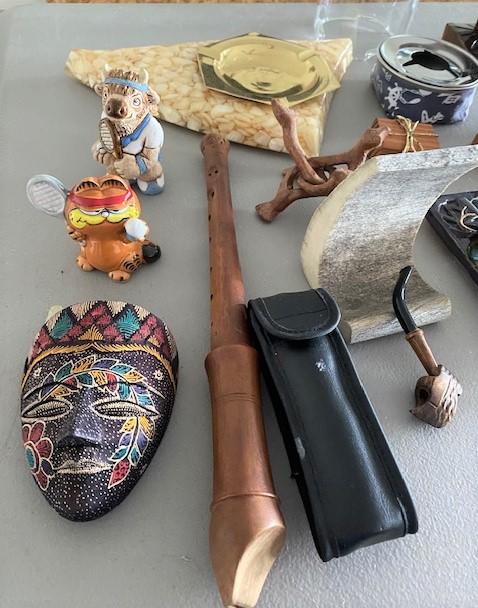 Includes: ashtrays, Toby style mugs, recorder, decorative mask & piece of bone. Measurement: 12"H (Tallest) 12"W (widest)