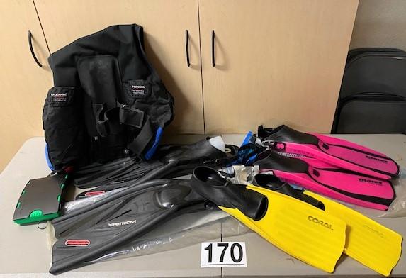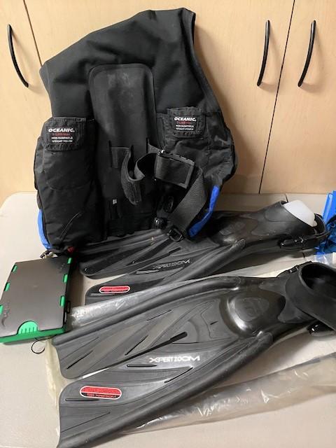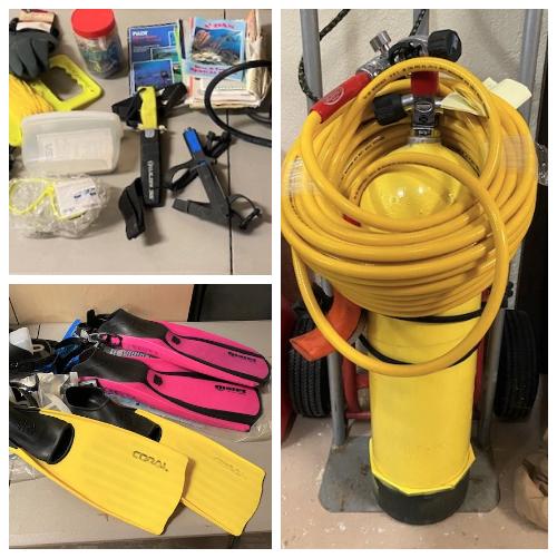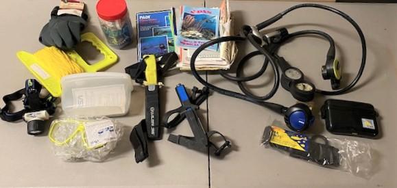 Includes flippers, BC, oxygen tank, regulators, dive books, and more.